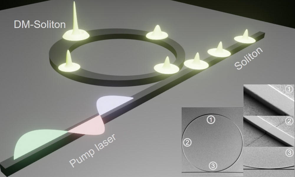 A new platform based on dispersion-managed silicon nitride microresonators operates at an 89 GHz repetition rate. Schematic inset shows SEM images of the ring-shaped microresonator, and zoomed-in views of the waveguide structure and the coupling gap. Credit: W. Wang, W. Liu, H. Liu, et al., doi: 10.1117/1.APN.4.3.036011