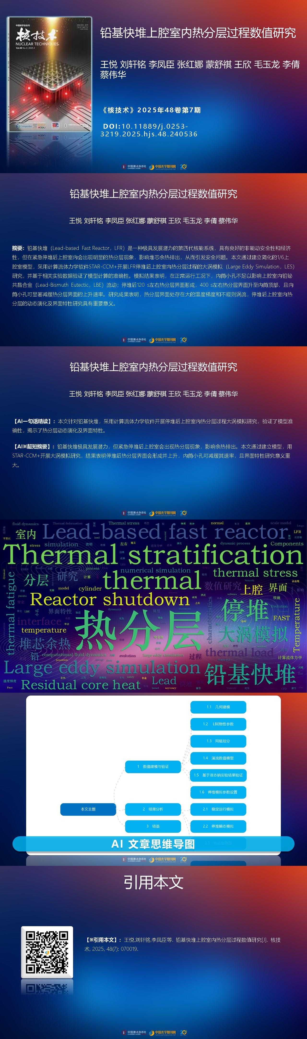 Yue WANG, Xuanming LIU, Fengchen LI, Hongna ZHANG, Shuqi MENG, Xin WANG, Yulong MAO, Qian LI, Weihua CAI. Numerical simulation of thermal stratification characteristics in the upper plenum chamber of lead-based fast reactors[J]. NUCLEAR TECHNIQUES, 2025, 48(7): 070019