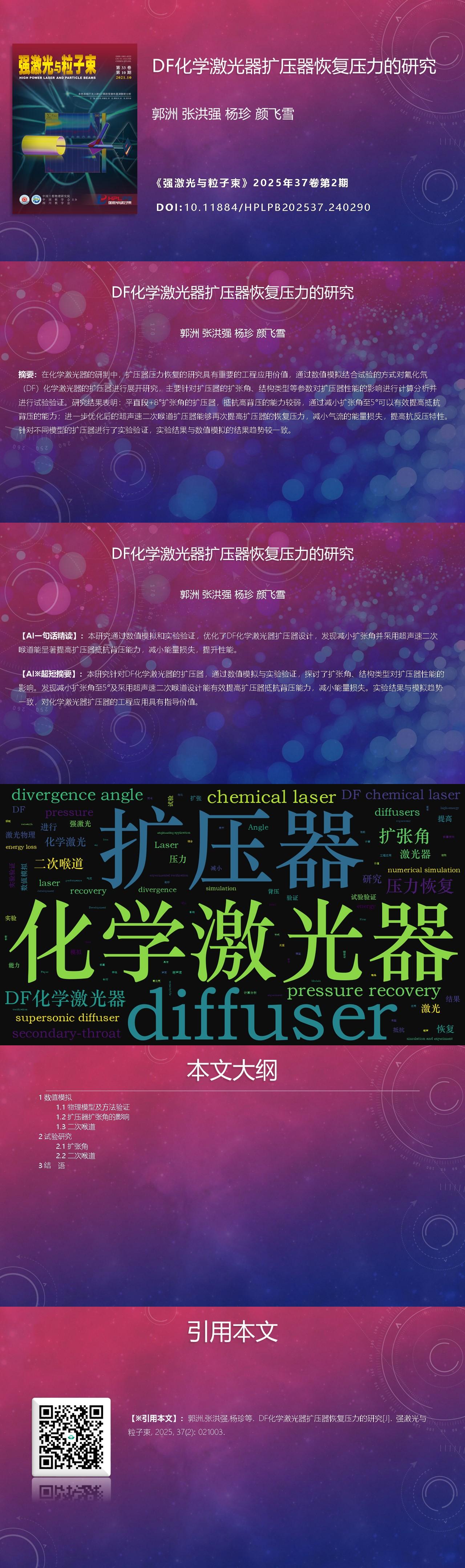 Zhou Guo, Hongqiang Zhang, Zhen Yang, Feixue Yan. Study on recovery pressure of diffuser for DF chemical laser[J]. High Power Laser and Particle Beams, 2025, 37(2): 021003