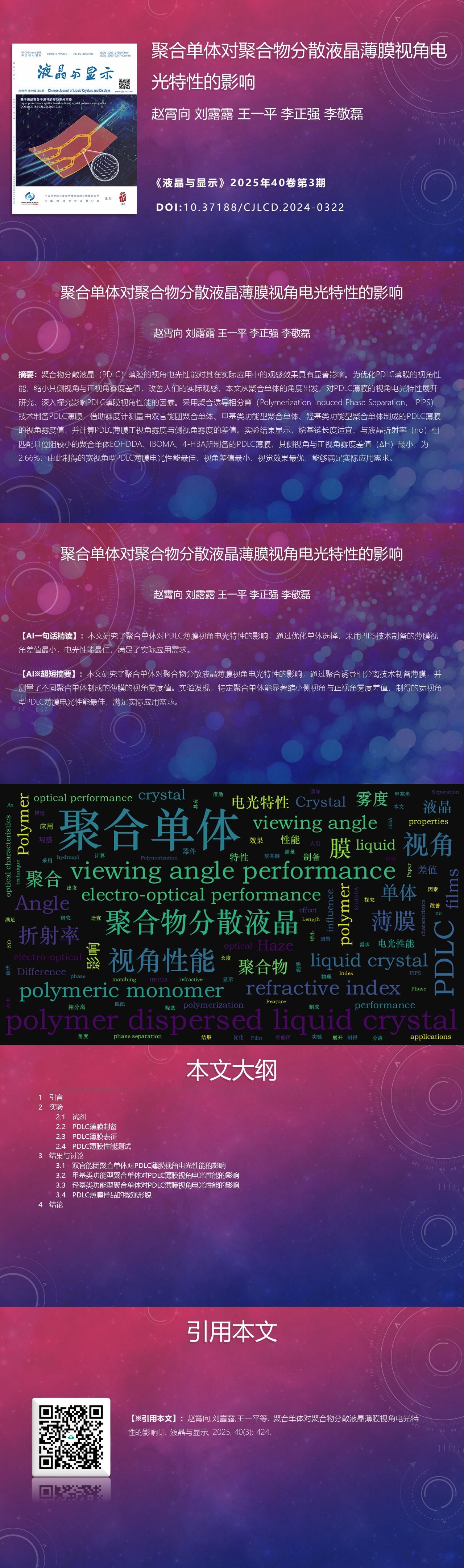 Xiaoxiang ZHAO, Lulu LIU, Yiping WANG, Zhengqiang LI, Jinglei LI. Influence of polymeric monomers on the electro-optic properties of polymer dispersed liquid crystal films[J]. Chinese Journal of Liquid Crystals and Displays, 2025, 40(3): 424
