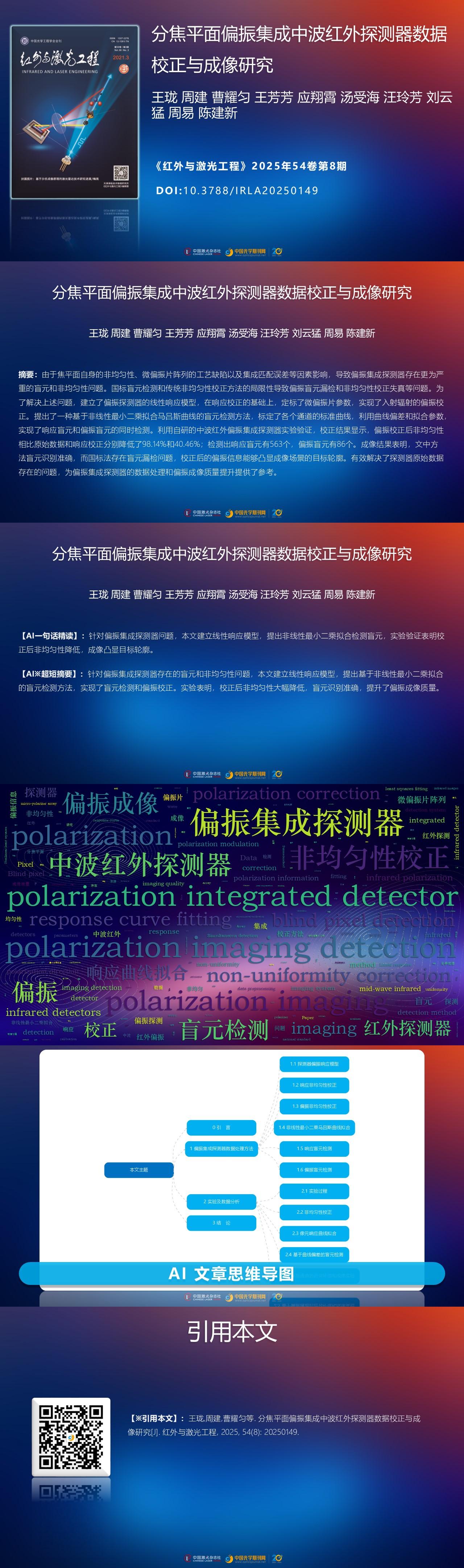 Results and Discussions The self-developed mid-wave infrared polarization integrated detector is used for experimental verification. The correction results show that the non-uniformity after polarization correction is reduced by 98.14% and 40.46% respectively compared with the original data and response correction data. 563 response blind pixels and 86 polarization blind pixels are detected. The imaging results show that the blind pixel recognition of this method is accurate, while the national standard method has the problem of blind pixel missed detection. The corrected polarization information can highlight the target contour of the imaging scene. The problem of the original data of the detector is effectively solved, which provides a reference for the data processing and polarization imaging quality improvement of the polarization integrated detector.