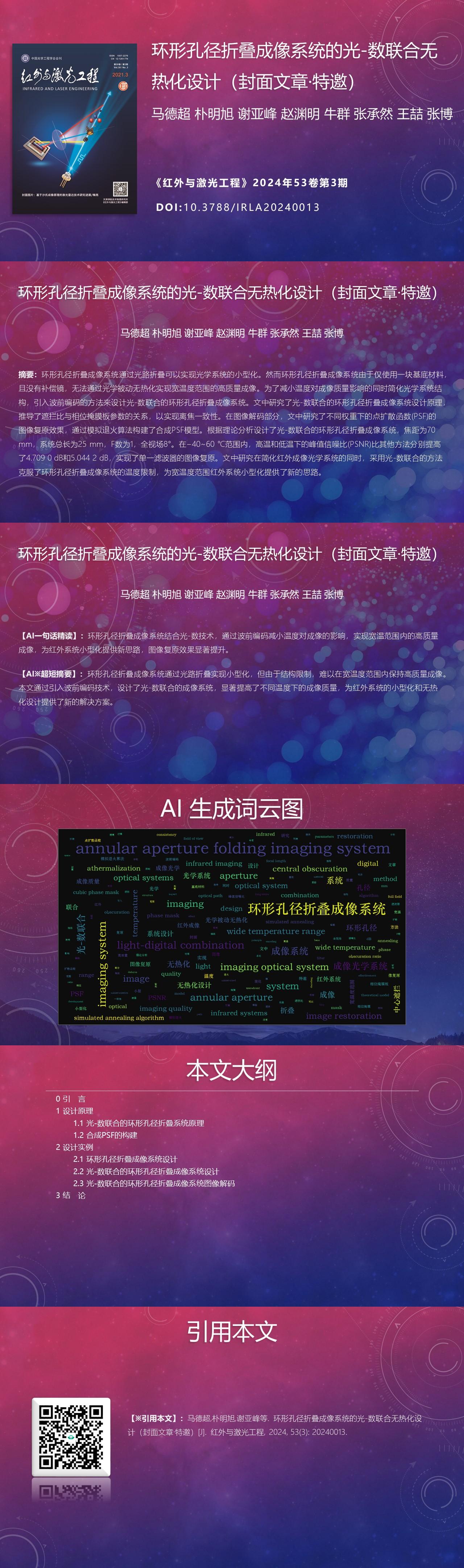ObjectiveWith the advancement and development of science and technology, the demand for miniaturized optical systems is becoming increasingly significant. The total length of the optical system can be reduced by folding the optical path in the annular aperture folding imaging system. However, the annular aperture folding imaging system only uses a piece of base material, so the annular aperture folding imaging system cannot achieve high-quality imaging in a wide temperature range. In order to reduce the impact of temperature on the imaging quality and simplify the optical system structure, the wavefront encoding method is introduced to design a light-digital combined annular aperture folding imaging system.