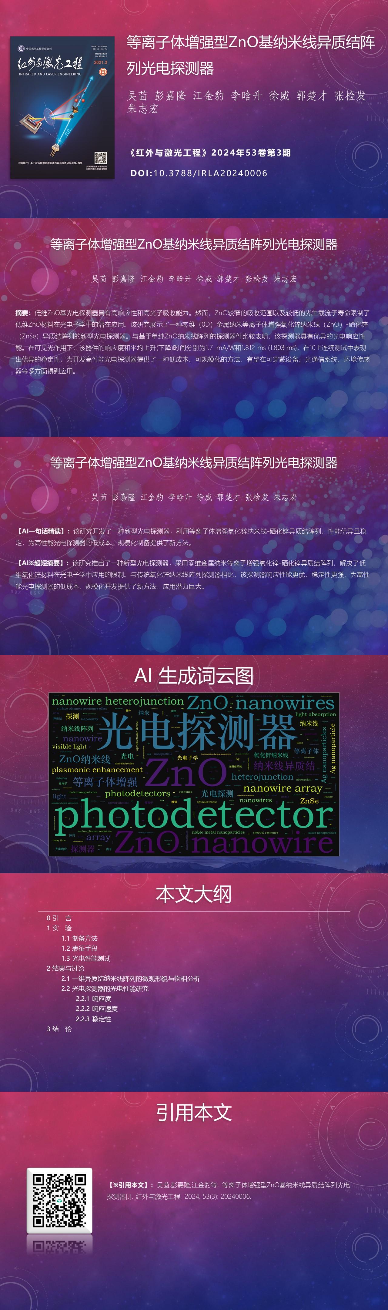 MethodsOne-dimensional (1D) ZnO nanowires with ZnSe shell heterostructures were synthesized on FTO substrate using low-temperature hydrothermal and chemical vapor deposition methods. Subsequently, silver nanoparticles were uniformly deposited on the heterojunction through capillary self-assembly, resulting in a plasmon-enhanced heterojunction array photodetector (Fig.1). The built-in electric field within the heterostructure accelerates the effective separation of photogenerated electrons and holes, thereby promoting the charge carrier transport characteristics of the optoelectronic device. Leveraging the surface plasmon resonance effect, noble metal nanoparticles exhibit excellent localized field enhancement, effectively enhancing the material's light absorption. Material morphology, structure, and chemical composition were characterized through scanning electron microscopy (SEM), transmission electron microscopy (TEM), X-ray spectroscopy (XRD), and Raman spectroscopy analyses. The photovoltaic characteristics of the detector were systematically analyzed using standard techniques such as the chopped light voltammetry method, optoelectronic transient response measurement, and time-current curves.