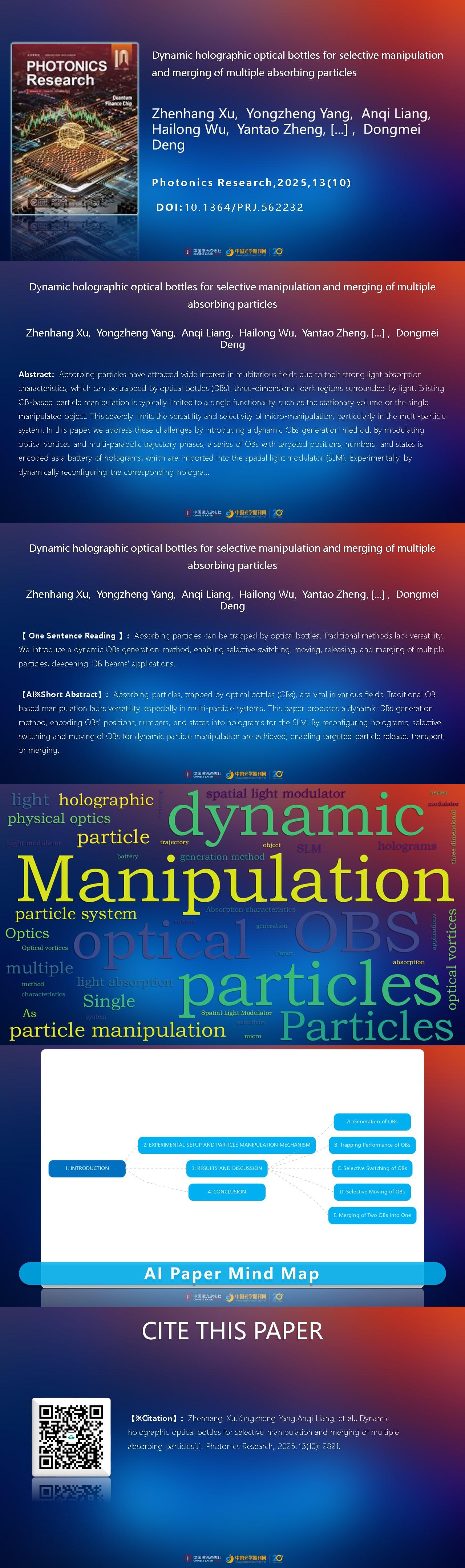 【AIGC Short Abstract】:Absorbing particles, trapped by optical bottles (OBs), are vital in various fields. Traditional OB-based manipulation lacks versatility, especially in multi-particle systems. This paper proposes a dynamic OBs generation method, encoding OBs' positions, numbers, and states into holograms for the SLM. By reconfiguring holograms, selective switching and moving of OBs for dynamic particle manipulation are achieved, enabling targeted particle release, transport, or merging.