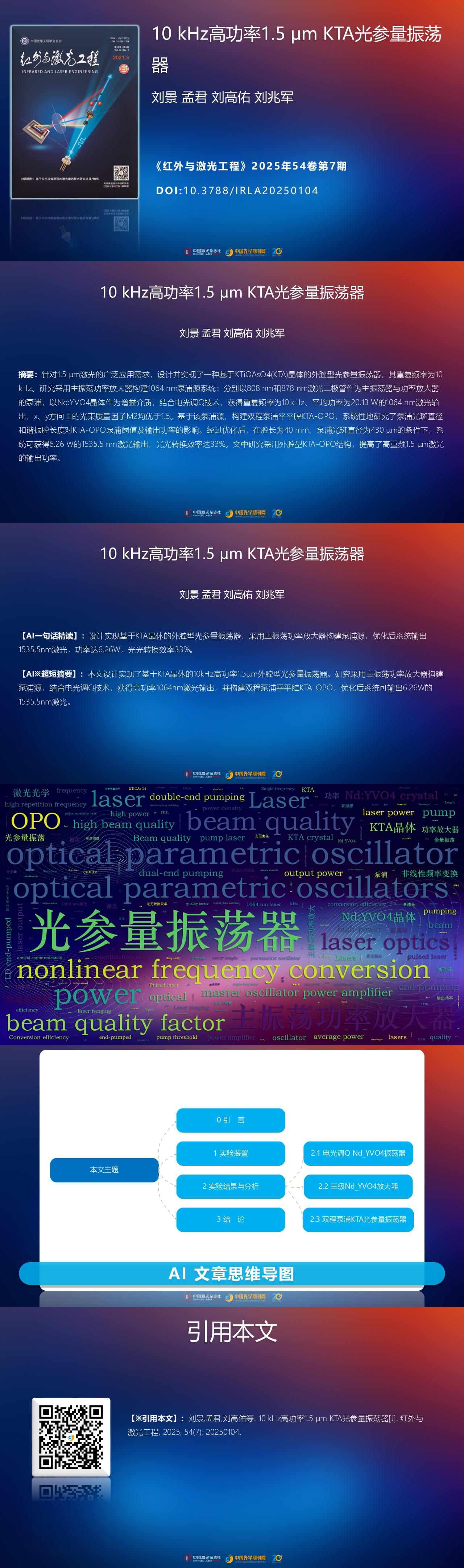1064 nm pump light with a beam quality factor better than 1.5 and a pulse repetition rate of 10 kHz was obtained, with an average power of 20.13 W. In the aspect of the KTA-OPO, the effects of cavity length and pump spot diameter on the pump threshold and conversion efficiency were comparatively studied. The pump spot parameters and resonator parameters were optimized to improve the conversion efficiency of the KTA-OPO, 1.5 μm pulsed laser with an average power of 6.26 W and a pulse width of less than 10 ns, corresponding to an optical-to-optical conversion efficiency of up to 33%. Adoption of extracavity KTA-OPO structure effectively improves the high-frequency 1.5 μm laser output power. Subsequent improvements should focus on enhancing the