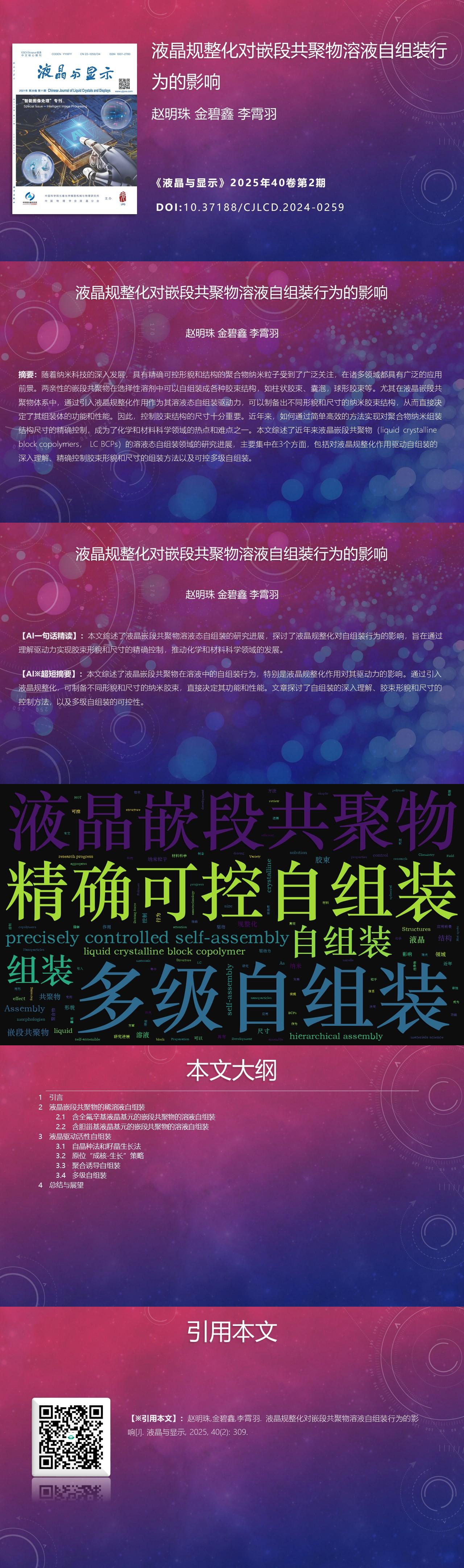 Mingzhu ZHAO, Bixin JIN, Xiaoyu LI. Effect of liquid crystalline ordering on the self-assembly behavior of block copolymers in solutions[J]. Chinese Journal of Liquid Crystals and Displays, 2025, 40(2): 309