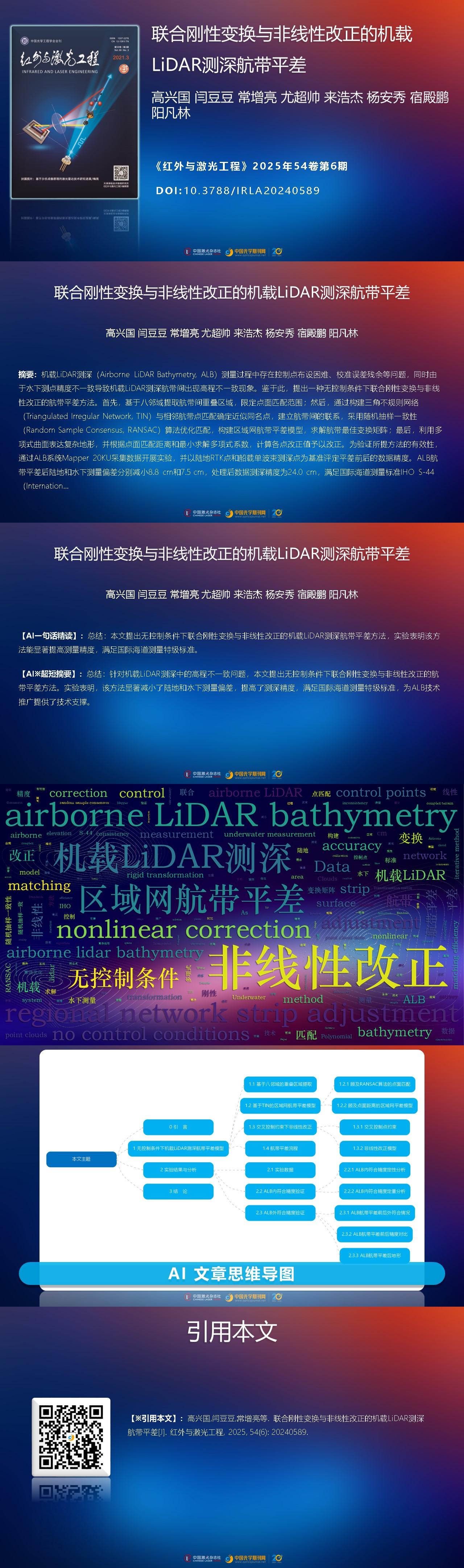 Results and DiscussionsTo verify the effectiveness of the proposed method, experiments were carried out using data collected by the ALB system Mapper 20KU, and the data accuracy before and after adjustment was evaluated based on land RTK points and shipborne single-beam bathymetry points. After the ALB strip adjustment, the land and underwater measurement deviations decreased by 8.8 cm and 7.5 cm respectively, and the processed data bathymetry accuracy was 24.0 cm.