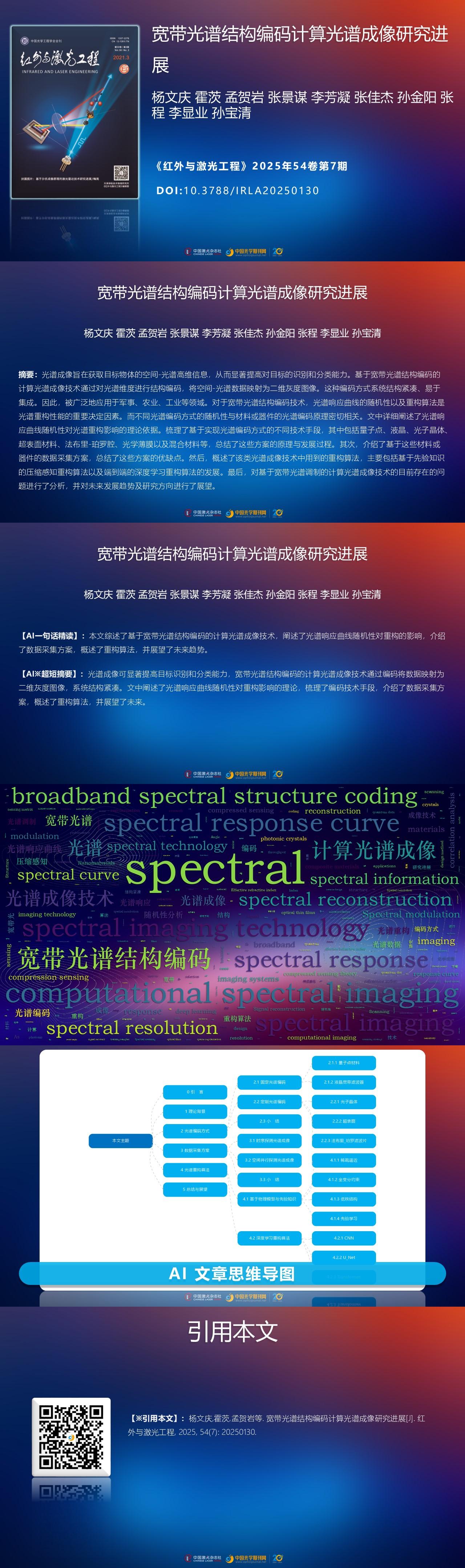 Progress First, the fundamental principles of computational imaging based on broadband spectral modulation are introduced, including the theory of compressed sensing, the mechanism of spectral modulation, and spectral reconstruction algorithms. In broadband spectral modulation-based computational spectral imaging, the spectrum of an object is modulated using broadband response materials, and the signal is captured by a detector without spectral resolution. According to compressed sensing theory, the number of samples required for signal reconstruction can be significantly smaller than the number of spectral channels. However, the spectral response curve of the materials must exhibit sufficient randomness. This is because, within the compressed sensing framework, the sensing matrix must have low correlation to efficiently sample the signal of objects. Since the spectral response curve of materials cannot be arbitrarily designed, enhancing its randomness becomes a critical area of research for computational spectral imaging systems based on spectral response. Conventional spectral response materials include nanomaterials (e.g., quantum dots, photonic crystals, metasurfaces, and nanowires), Fabry-Perot (F-P) cavities, liquid crystals, optical films, and composite materials. The principles of spectral modulation vary across these materials. For example, quantum dot materials can shift the spectral response by adjusting their size. Photonic crystals and metasurfaces achieve spectral modulation by altering their microstructures. Fabry-Perot (F-P) cavities modulate the spectral response by changing the cavity length or the refractive index of the material inside the cavity. Liquid crystal filters control the effective refractive index by varying the applied voltage, which induces different phase delays for different wavelengths, resulting in wavelength-dependent intensity attenuation and modulation of the spectrum. Optical thin films enable spectral modulation by controlling the number of layers, the refractive index, and the thickness of the filter layers. Although various spectral response curves can be generated, their shapes cannot be arbitrarily controlled. As a result, researchers typically design a mass of broadband spectral response curves and then select those with the lowest correlation based on correlation analysis. The result-oriented reverse design method allows for the selection of a target spectral curve from a set of potential curves. This method reduces the sensitivity of the spectral curve to angle variations and noise during the optimization process and can even enable the design of arbitrary spectral curves. Consequently, this approach has become a key technique in spectral response imaging. Furthermore, Spectral modulation materials have certain limitations. For instance, photonic crystals and metasurfaces are sensitive to incident angle. Quantum dot materials suffers from light fluorescence loss and low throughput. To address these challenges, some researchers have investigated the use of mixed materials for spectral modulation, aiming to overcome the limitations of individual materials.