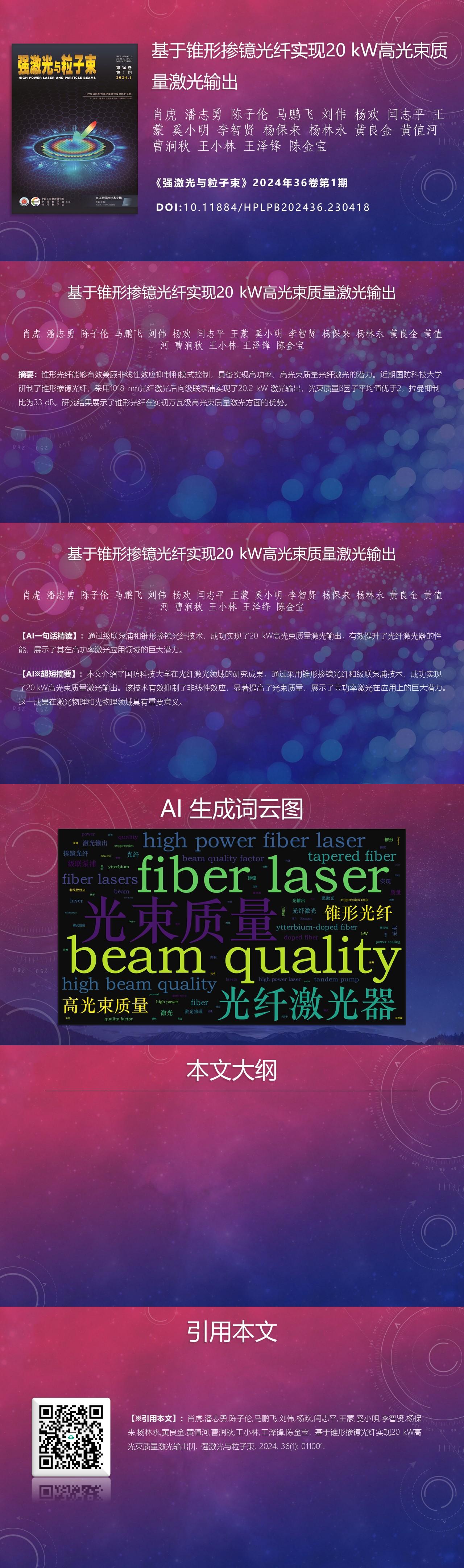 Hu Xiao, Zhiyong Pan, Zilun Chen, Pengfei Ma, Wei Liu, Huan Yang, Zhiping Yan, Meng Wang, Xiaoming Xi, Zhixian Li, Baolai Yang, Linyong Yang, Liangjin Huang, Zhihe Huang, Jianqiu Cao, Xiaolin Wang, Zefeng Wang, Jinbao Chen. 20 kW fiber laser with high beam quality enabled by tapered ytterbium-doped fiber[J]. High Power Laser and Particle Beams, 2024, 36(1): 011001