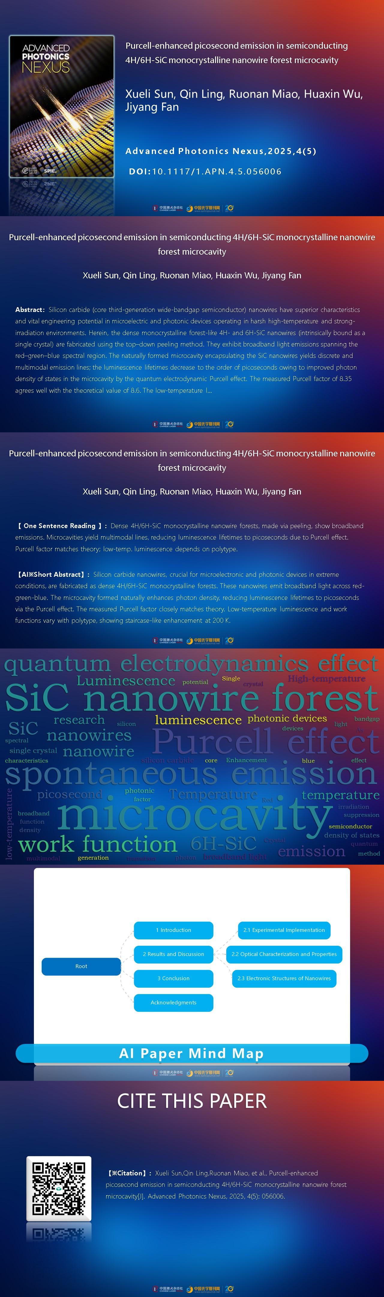 We have studied the unique photophysical properties of the structurally and electronically interconnected forest-like SiC NWs. They exhibit Fabry–Pérot cavity mode spontaneous emission, which is significantly enhanced owing to the vacuum fluctuation-induced Purcell effect. The PL shows abrupt enhancement at an elevated temperature of 200 K. The polytype has a significant influence on the electronic properties of the SiC NWs. Considering their excellent mechanical properties, strong resistance to irradiation, and superior electric properties, these monolithic SiC NW forests with cavity-mode-limited spontaneous emissions may have unique applications in field electron emission, sensors, and electromagnetic microwave absorption. They may also be applied in microscale and nanoscale integrated photonic devices as integratable and SiC chip-compatible micro light emitters and in semiconductor–metal integrated optoelectronic devices. The implementation of micro- and nano-laser arrays is also conceivable considering the wide-region tunable emission wavelengths of such SiC NWs.