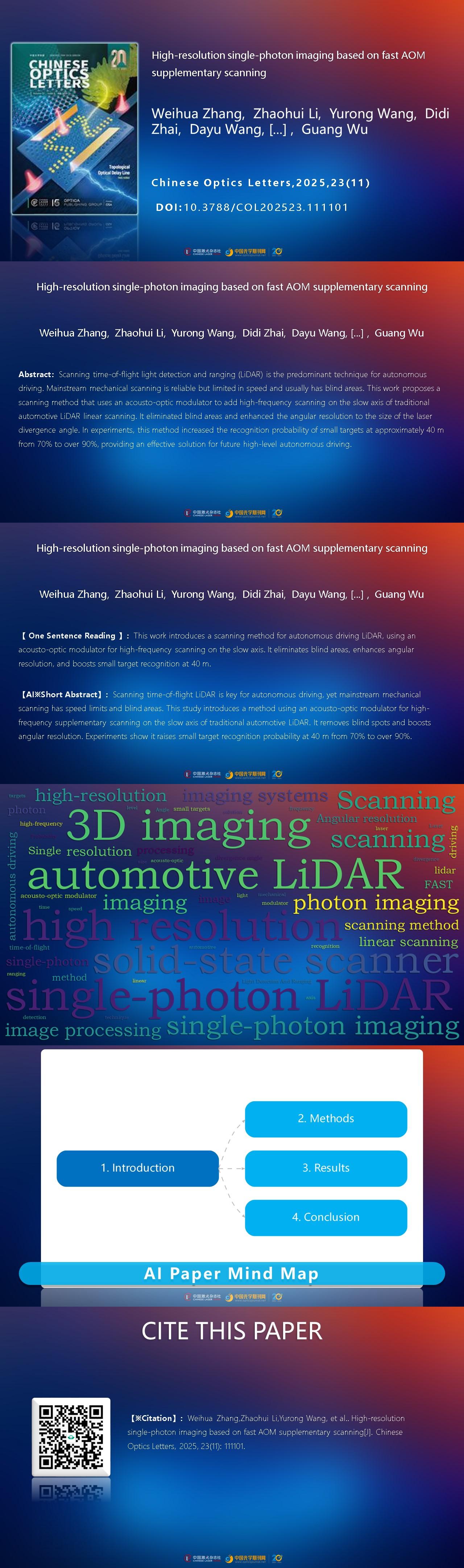【AIGC Short Abstract】:Scanning time-of-flight LiDAR is key for autonomous driving, yet mainstream mechanical scanning has speed limits and blind areas. This study introduces a method using an acousto-optic modulator for high-frequency supplementary scanning on the slow axis of traditional automotive LiDAR. It removes blind spots and boosts angular resolution. Experiments show it raises small target recognition probability at 40 m from 70% to over 90%.