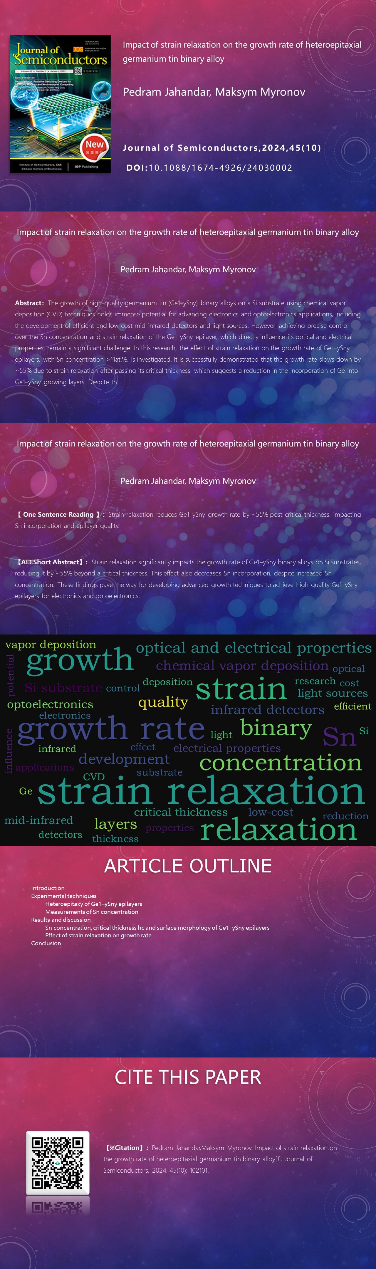 Pedram Jahandar, Maksym Myronov. Impact of strain relaxation on the growth rate of heteroepitaxial germanium tin binary alloy[J]. Journal of Semiconductors, 2024, 45(10): 102101