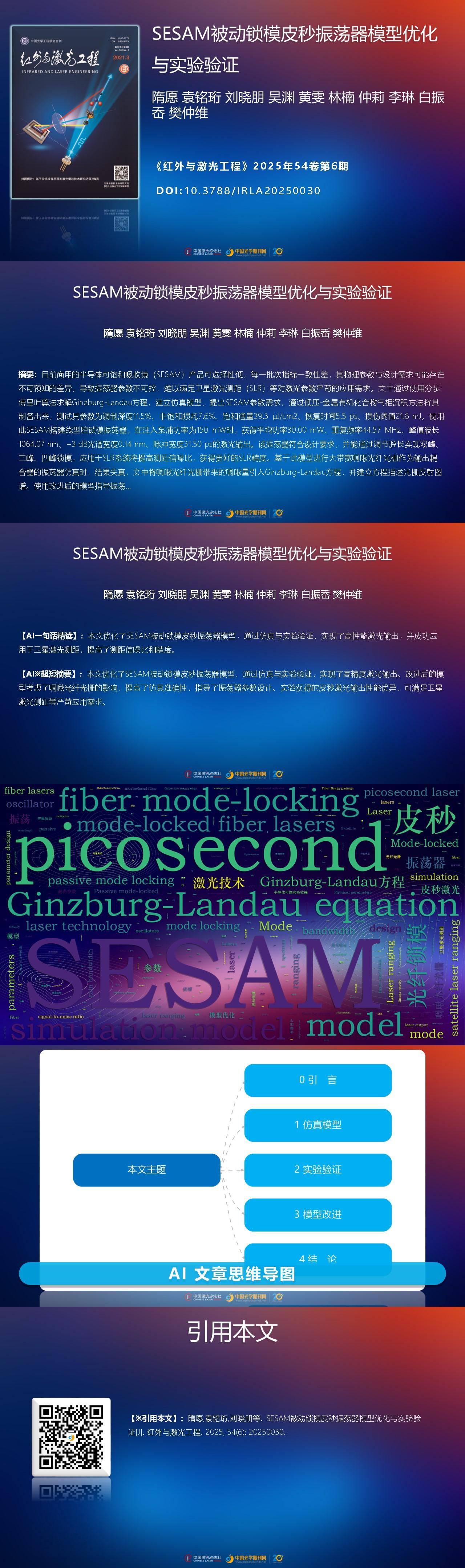 ObjectiveLaser has good directionality, high brightness, good monochromaticity, and strong coherence, making it significantly advantageous in the field of ranging. Satellite laser ranging (SLR) is the most accurate satellite ranging technology, and the kilohertz picosecond laser is the iconic light source of the fourth-generation satellite laser ranging. In kilohertz picosecond lasers, regenerative amplifiers are commonly used to amplify the mode-locked pulses, typically using Nd:YAG as the gain crystal with a gain bandwidth of 0.15 nm. In addition, the smaller the bandwidth of the narrowband filter used for satellite ranging, the less the influence of ambient light, and the higher the signal-to-noise ratio. The narrowband filter bandwidth used by several observatories we cooperate with is 0.2 nm, so the laser spectrum width needs to be less than 0.2 nm. To match the gain bandwidth of the regenerative amplifier with the bandwidth of the narrowband filter, a requirement of an output spectrum width of 0.15 nm was proposed for the oscillator. Semiconductor saturable absorber mirrors (SESAM) have the advantages of stable performance, simple structure, low mode locking threshold, and the ability to achieve full fiber integration. It has been widely used in mode-locked fiber lasers and has achieved product commercialization. Most commercial applications of picosecond lasers are generated by SESAM passive mode locking technology. SESAM products on the market have low selectivity and the consistency of each batch is poor. There may be unpredictable differences between the physical parameters of SESAM and the design requirements, resulting in uncontrollable oscillator parameters. Therefore, this study improved the passive mode locking model of SESAM to guide the design of oscillator parameters.