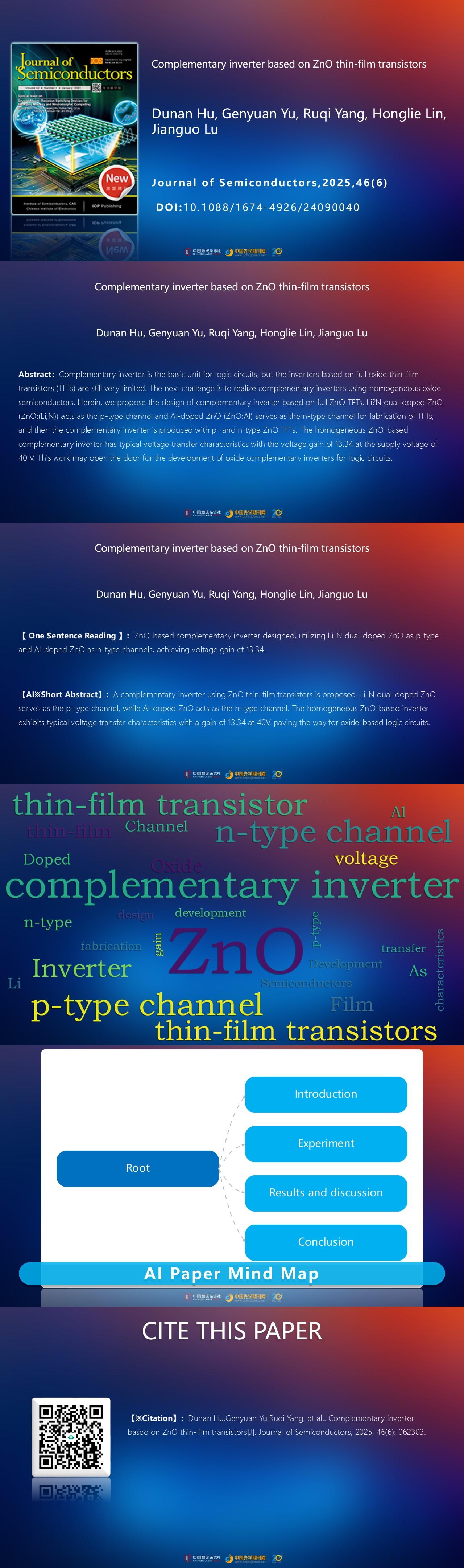 【AIGC Short Abstract】:A complementary inverter using ZnO thin-film transistors is proposed. Li-N dual-doped ZnO serves as the p-type channel, while Al-doped ZnO acts as the n-type channel. The homogeneous ZnO-based inverter exhibits typical voltage transfer characteristics with a gain of 13.34 at 40V, paving the way for oxide-based logic circuits.