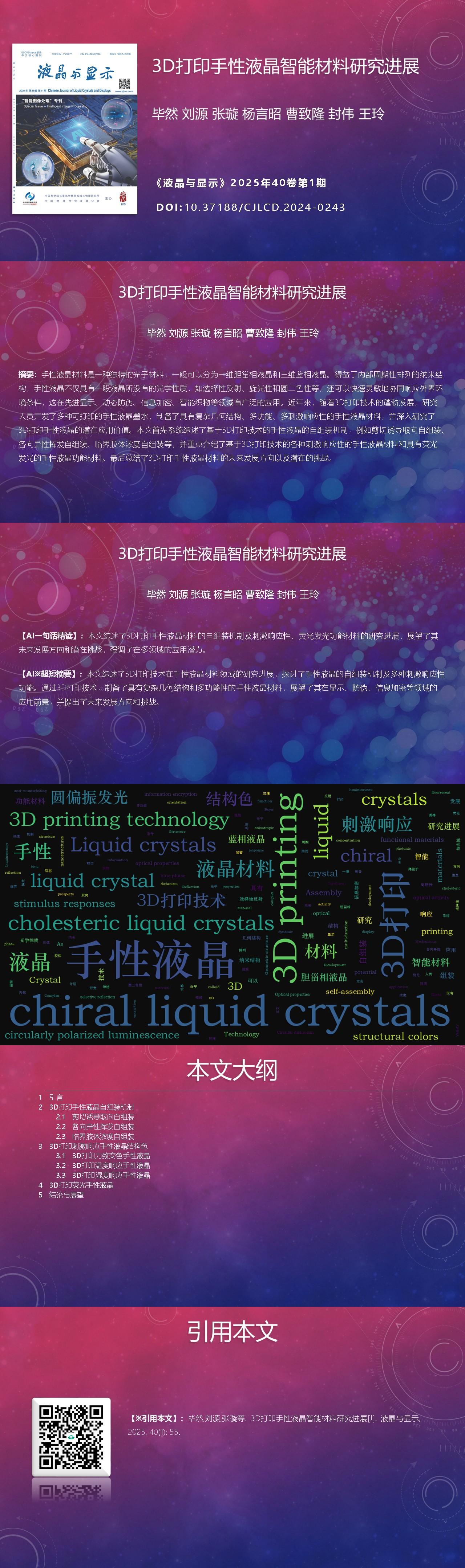 Ran BI, Yuan LIU, Xuan ZHANG, Yanzhao YANG, Zhilong CAO, Wei FENG, Ling WANG. Recent advances in 3D printed smart chiral liquid crystals[J]. Chinese Journal of Liquid Crystals and Displays, 2025, 40(1): 55