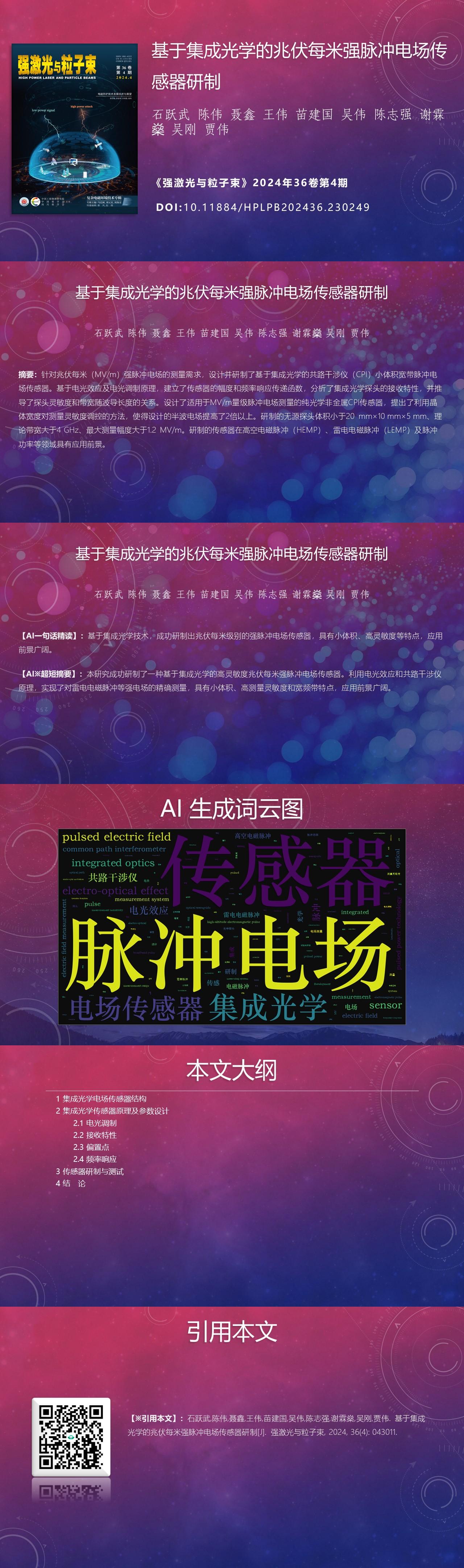 Yuewu Shi, Wei Chen, Xin Nie, Wei Wang, Jianguo Miao, wei Wu, Zhiqiang Chen, Linshen Xie, Gang Wu, Wei Jia. Development of the integrated-optics-based sensor for MV/m intense pulse electric field[J]. High Power Laser and Particle Beams, 2024, 36(4): 043011