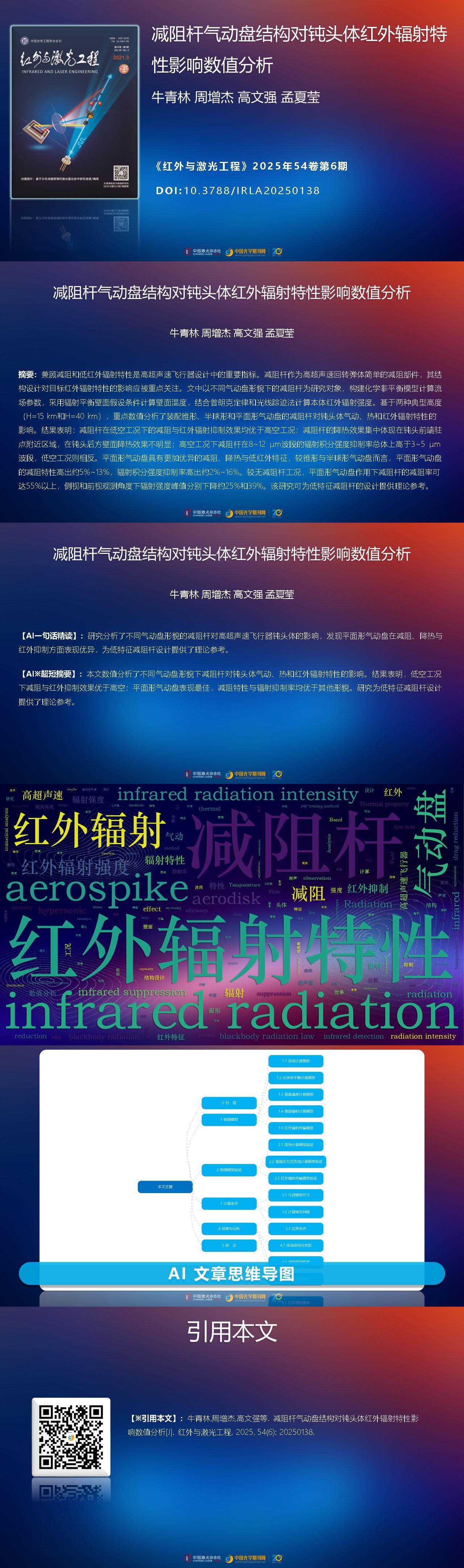 Qinglin NIU, Zengjie ZHOU, Wenqiang GAO, Xiaying MENG. Numerical analysis of aerodisk effects on infrared radiation signatures for spiked blunt bodies[J]. Infrared and Laser Engineering, 2025, 54(6): 20250138