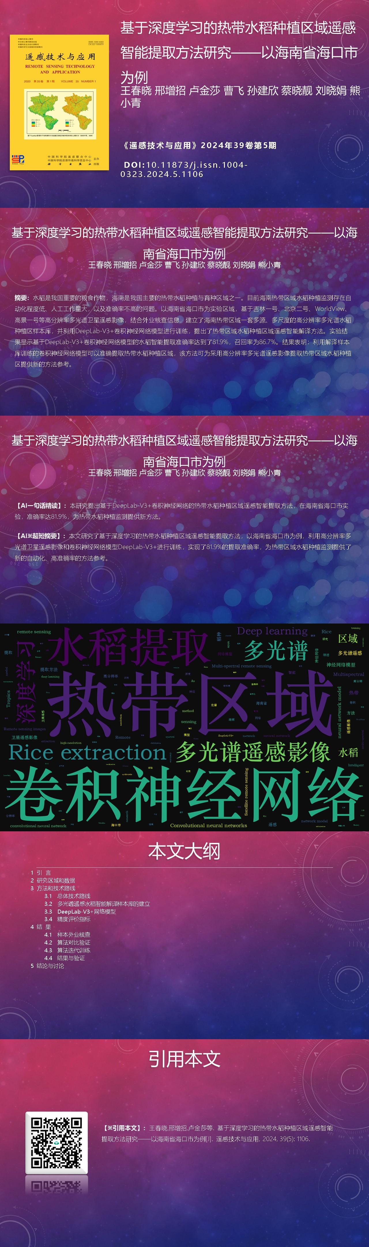 Chunxiao WANG, Zengzhao XING, Jinsha LU, Fei CAO, Jianxin SUN, Xiaojing CAI, Xiaojuan LIU, Xiaoqing XIONG. Research on Remote Sensing Intelligent Extraction Method of Tropical Rice Planting Area based on Deep Learning: A Case Study of Haikou City, Hainan Province[J]. Remote Sensing Technology and Application, 2024, 39(5): 1106