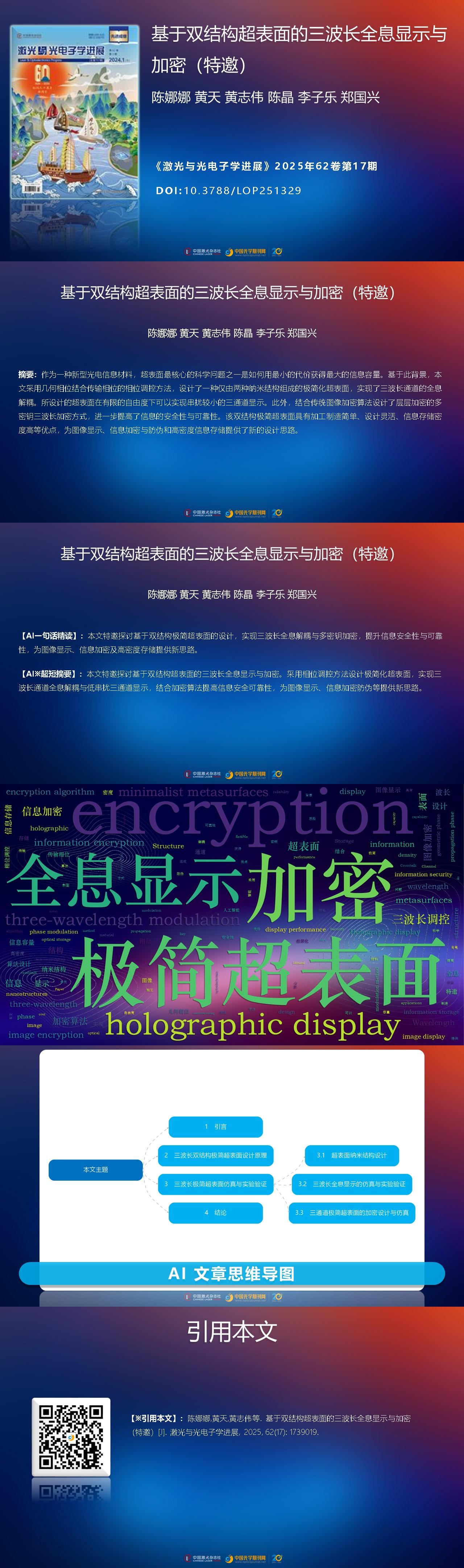 Nana Chen, Tian Huang, Zhiwei Huang, Jing Chen, Zile Li, Guoxing Zheng. Three-Wavelength Holographic Display and Encryption Based on Dual-Structure Metasurfaces (Invited)[J]. Laser & Optoelectronics Progress, 2025, 62(17): 1739019