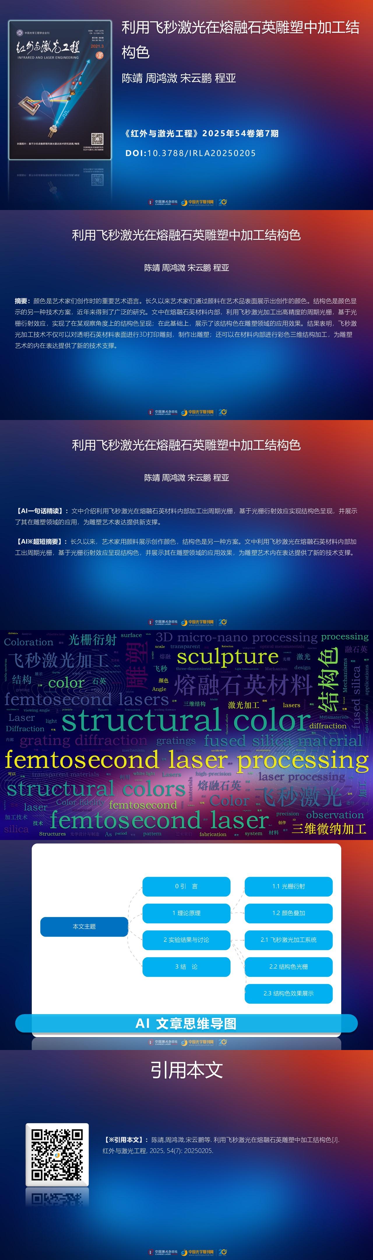 ConclusionsThis study investigates structural coloration in fused silica through femtosecond laser processing, theoretically analyzing the diffraction-based mechanisms of periodic gratings and demonstrating their applications in artistic patterns and sculptures. The principal findings are summarized as follows: 1) By utilizing femtosecond laser processing to fabricate micrometer-scale high-precision gratings, structural colors can be observed at specific viewing angles. Leveraging this characteristic, we have achieved chromatic display of processed structures and patterns inside transparent materials. 2) To simplify fabrication, this study adopts the diffraction mechanism of gratings to demonstrate structural colors. These colors exhibit viewing angle selectivity, producing different visual effects at various observation angles. However, due to the uneven surface of the sculpture, the structural color observation effect within the sculpted area remains suboptimal. Future sculpture designs could incorporate observation window features to facilitate the viewing of more refined structural colors. 3) Novel structural color mechanisms, such as optical metamaterials, hold promise for enabling structural color displays across broader viewing angle ranges, thereby addressing the current limitation of single-angle observation dependency. These findings demonstrate that femtosecond lasers can create chromatic 3D architectures inside transparent materials, establishing a novel paradigm for sculptural design. The technology expands artistic possibilities by integrating internal color engineering with volumetric fabrication, offering unprecedented spatial and chromatic control in sculptural applications.