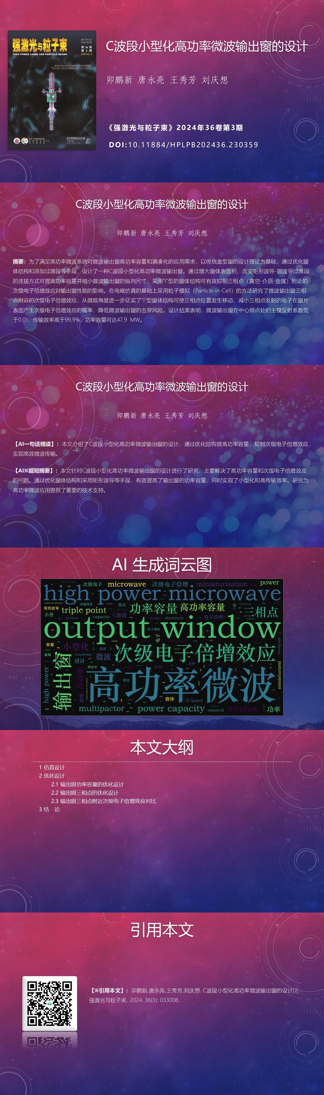 Pengxin Mao, Yongliang Tang, Xiufang Wang, Qingxiang Liu. Design and research of C-band miniaturized high power microwave output window[J]. High Power Laser and Particle Beams, 2024, 36(3): 033008