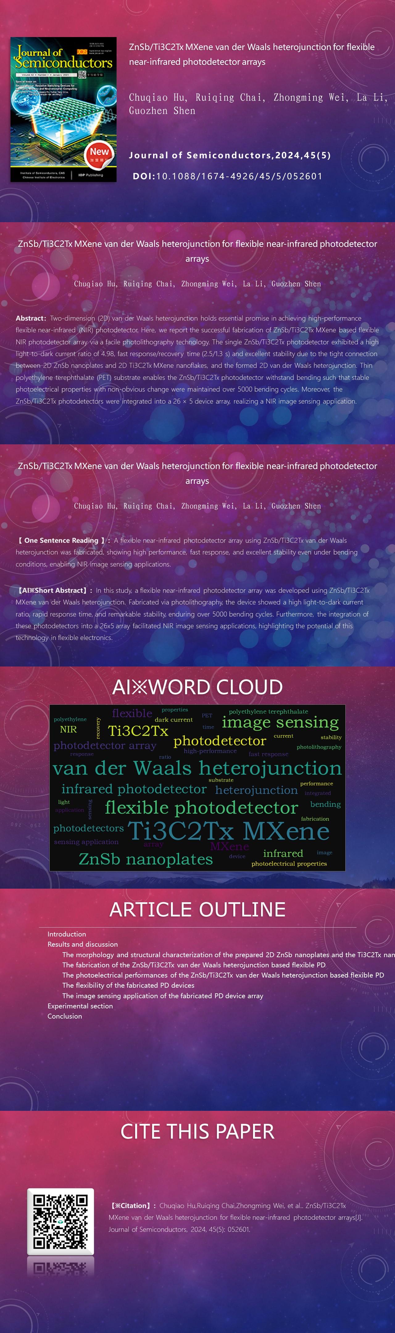 【AIGC Short Abstract】:In this study, a flexible near-infrared photodetector array was developed using ZnSb/Ti3C2Tx MXene van der Waals heterojunction. Fabricated via photolithography, the device showed a high light-to-dark current ratio, rapid response time, and remarkable stability, enduring over 5000 bending cycles. Furthermore, the integration of these photodetectors into a 26x5 array facilitated NIR image sensing applications, highlighting the potential of this technology in flexible electronics.