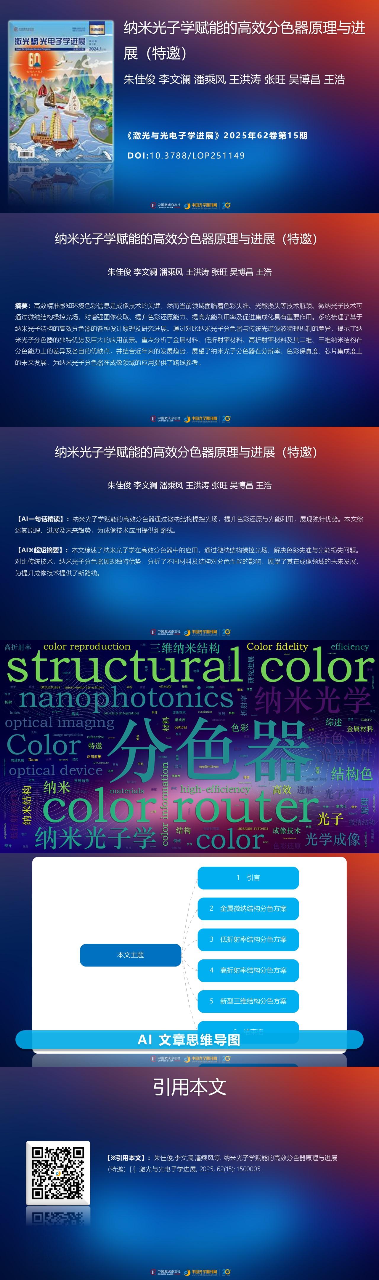 Jiajun Zhu, Wenlan Li, Chengfeng Pan, Hongtao Wang, Wang Zhang, Bochang Wu, Hao Wang. Principles and Advances of Nanophotonics Enabled High-Efficiency Color Routers (Invited)[J]. Laser & Optoelectronics Progress, 2025, 62(15): 1500005