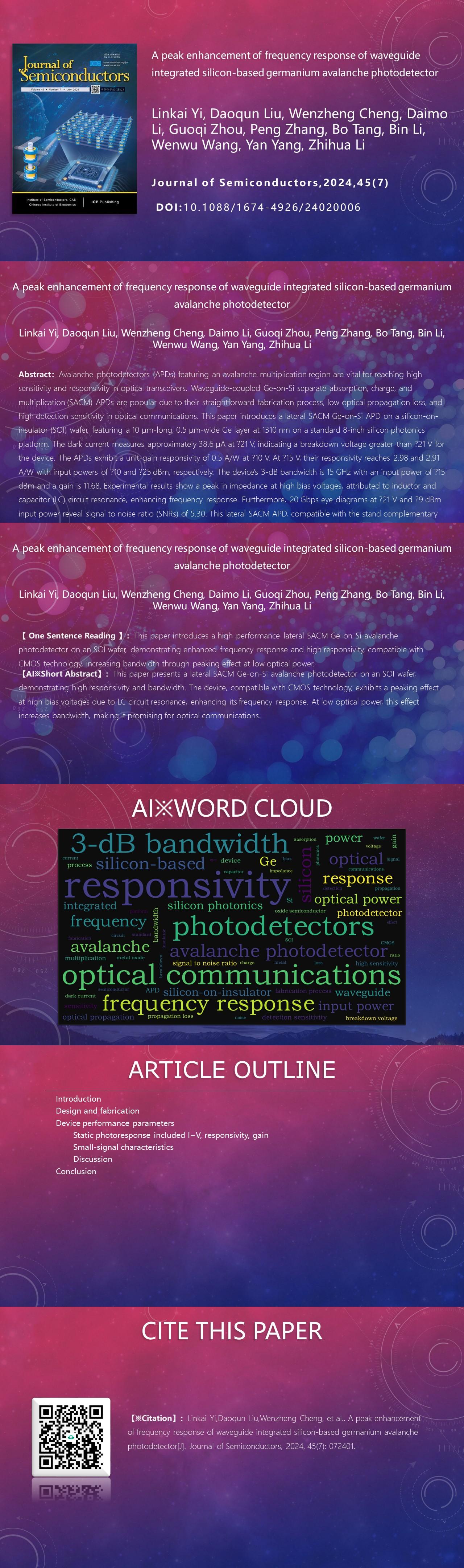 Recent efforts have aimed at enhancing Ge-on-Si APDs' performance. For instance, Huang et al. added an silicon layer to control the electrical field distribution at O-band, the result shows that 3dB-bandwidth is 56 GHz, and the responsivity is 1.08 A/W[24]. Zeng et al. studied the impact of voltages and input powers on 3-dB bandwidth, employing an effective equivalent voltage for a quantitative analysis[25]. Zhang et al. discovered that surface defects and strong electric fields at the sidewalls lead to significant leakage currents[26]. SACM Ge-on-Si APDs get more attention. Studies show that vertical SACM Ge-on-Si APDs operate effectively at voltages below −10 V[22, 27, 28]. Fabricating these APDs involves silicon epitaxial growth and the addition of metal electrodes in the germanium layer which will reduce the primary responsivity. In contrast, lateral SACM Ge-on-Si APDs are emerging, eliminating the need for silicon epitaxy growth and metal contact steps. Some studies have focused on increasing the device's bandwidth by etching shallow trenches on the left and right sides of the Ge[29−31]. These devices exhibit low responsivity at unit gain and high dark current. Additionally, controlling the doping region for designs narrower than 100 nm is challenging[30]. Efforts to improve absorption efficiency have achieved a 3-dB bandwidth of 48 GHz and a high primary responsivity of 0.93 A/W[32]. Furthermore, Li et al. have extended the 3-dB bandwidth to 75 GHz using inductive-gain-peaking technology[33]. Lischke et al. utilized a Fin structure in germanium to achieve a 3-dB bandwidth to 265 GHz[4]. Chowdhury et al. demonstrated a lateral SACM Ge-on-Si APD whose responsivity at the bias voltage of 5 V is 26 A/W. Peng et al. showcased all-Si 20 Gb/s avalanche photodiodes with a responsivity exceeding 65 A/W[34]. Zhang et al. were the first to use an InGaAs/InAlAs APD on a silicon platform, achieving a gain exceeding 70 at 1570 nm[35].