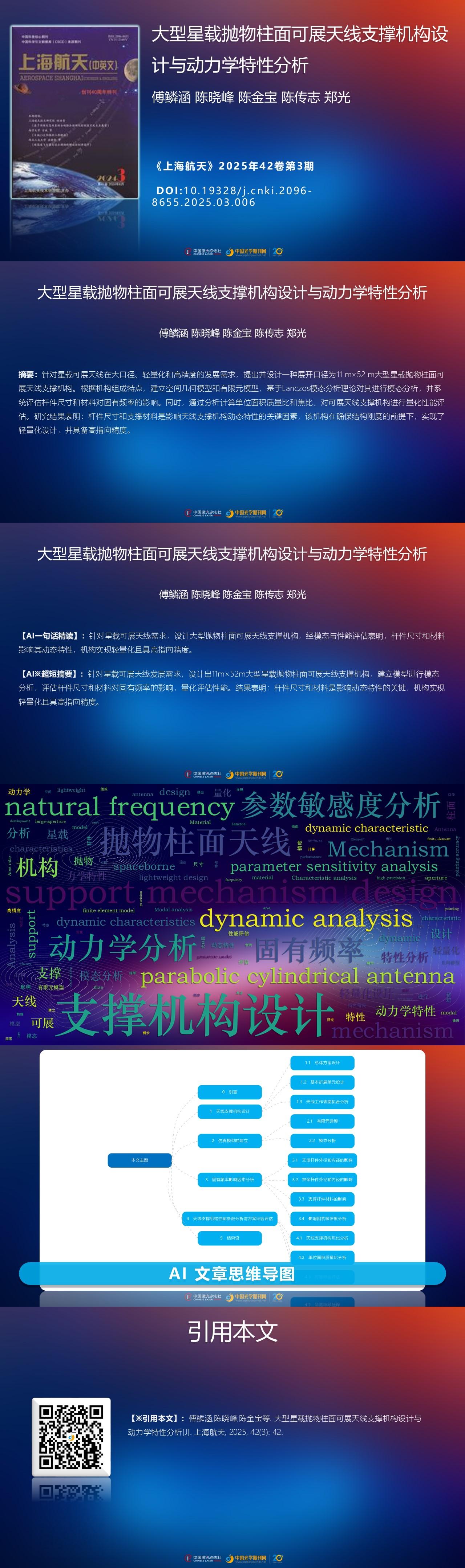 Linhan FU, Xiaofeng CHEN, Jinbao CHEN, Chuanzhi CHEN, Guang ZHENG. Design and Dynamic Characteristic Analysis of a Support Mechanism for Large Parabolic Cylindrical Spaceborne Deployable Antennas[J]. AEROSPACE SHANGHAI, 2025, 42(3): 42