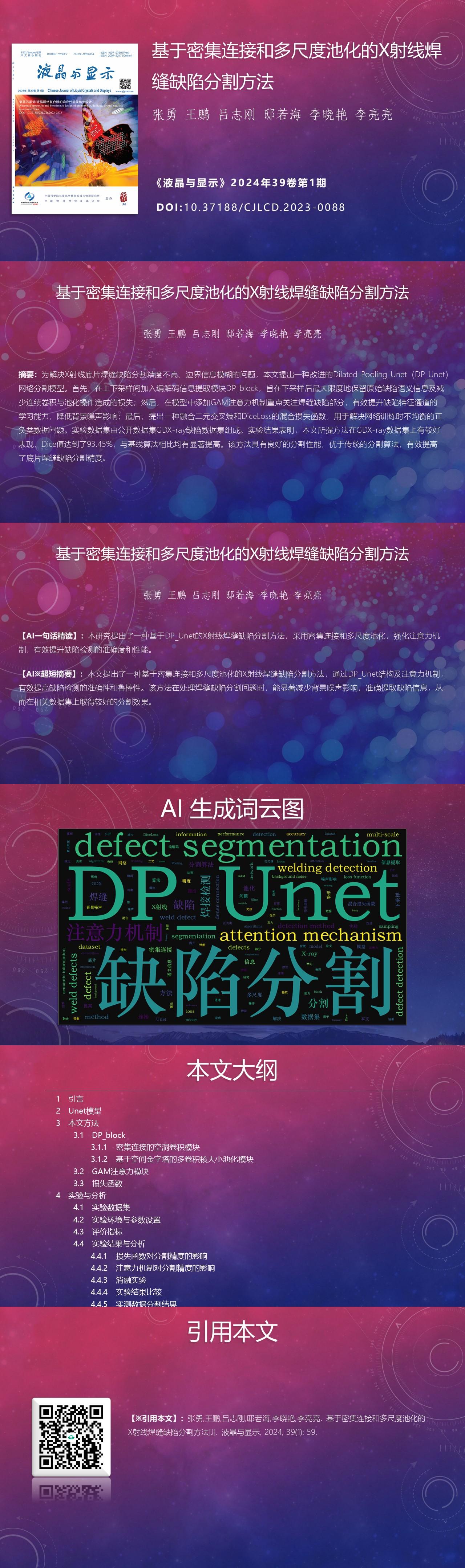 Yong ZHANG, Peng WANG, Zhigang LÜ, Ruohai DI, Xiaoyan LI, Liangliang LI. X-ray weld defect detection method based on dense connection and multi-scale pooling[J]. Chinese Journal of Liquid Crystals and Displays, 2024, 39(1): 59