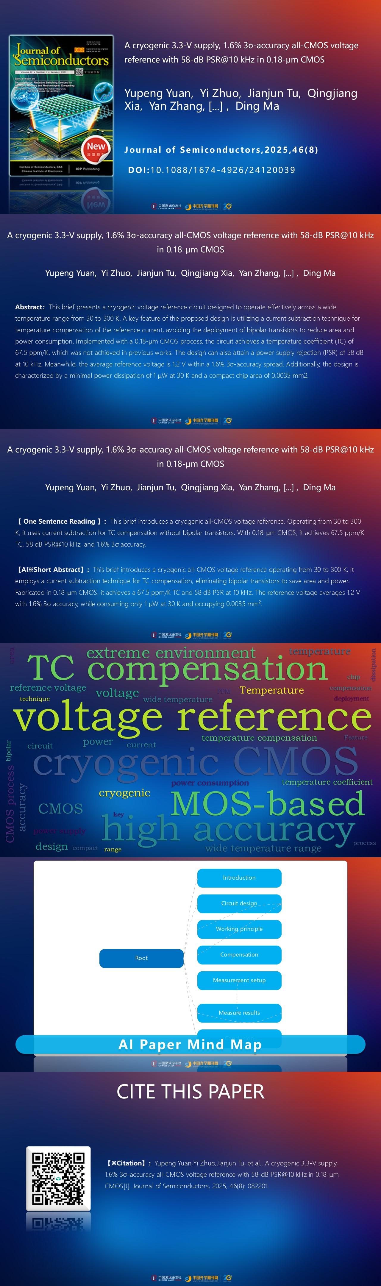 Yupeng Yuan, Yi Zhuo, Jianjun Tu, Qingjiang Xia, Yan Zhang, Wengao Lu, Xiangyang Li, Ding Ma. A cryogenic 3.3-V supply, 1.6% 3σ-accuracy all-CMOS voltage reference with 58-dB PSR@10 kHz in 0.18-μm CMOS[J]. Journal of Semiconductors, 2025, 46(8): 082201