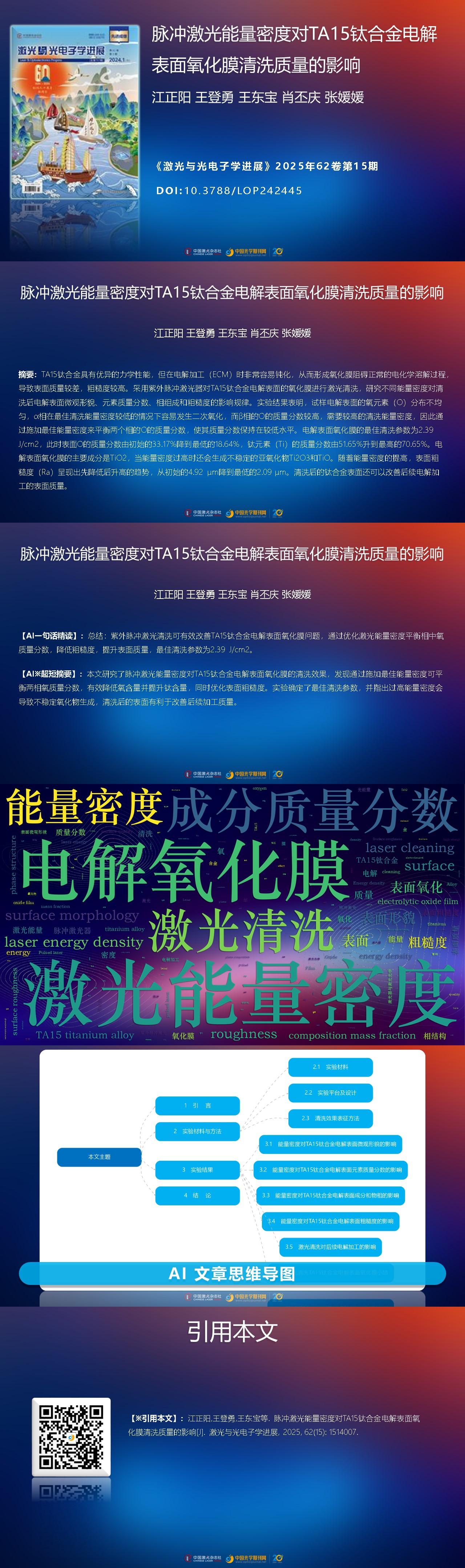 Zhengyang Jiang, Dengyong Wang, Dongbao Wang, Piqing Xiao, Yuanyuan Zhang. Effect of Pulsed Laser Energy Density on Cleaning Quality of TA15 Titanium Alloy Oxide Film on Electrolytic Surface[J]. Laser & Optoelectronics Progress, 2025, 62(15): 1514007
