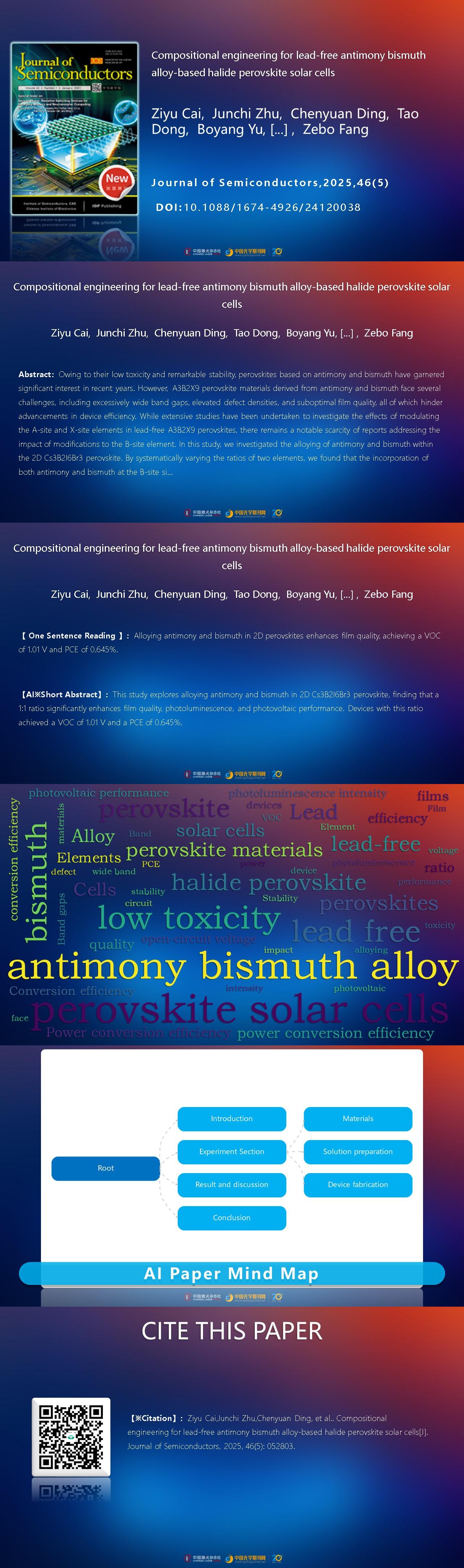 Currently, the efficiencies of antimony-based and bismuth-based perovskite devices remain relatively low, primarily due to intrinsic characteristics such as poor film quality, excessively wide bandgaps, and a high density of deep energy level defects[10−11]. There has been extensive research on the effects of changing the A-site and X-site components in lead-free perovskites of the A3B2X9 structure. It is evident that 2D structures are more advantageous than 0D structures in reducing non-radiative recombination and promoting charge carrier transport, leading to better optoelectronic performance. Therefore, dimensional control is one of the most effective pathways to improve device efficiency. However, there is limited reports on the effects of modifying the B-site components[12−15]. The aforementioned studies clearly demonstrate that bismuth-based and antimony-based perovskites share a high degree of structural and property similarity. Thus, mixing antimony and bismuth elements to create a new B-site hybrid lead-free perovskite is a promising approach.