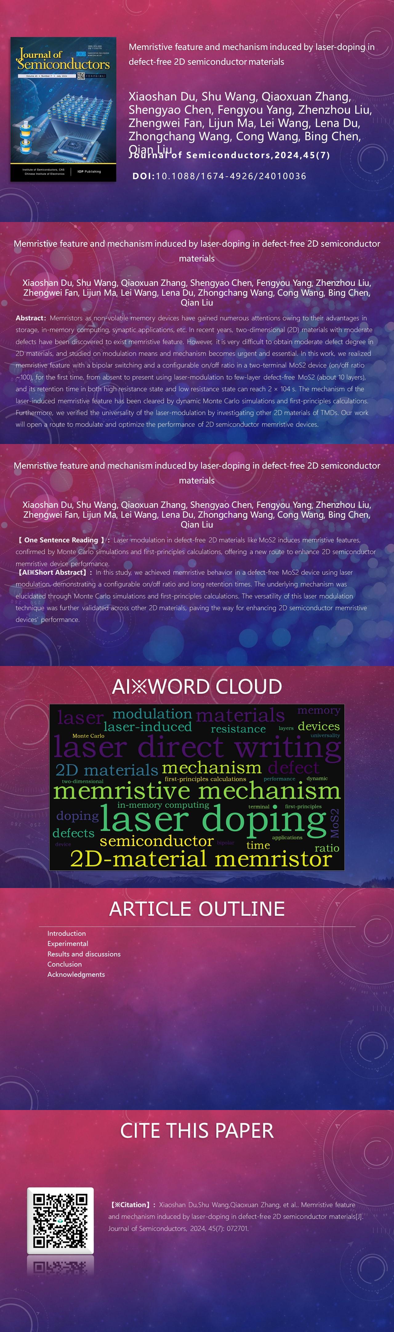 【AIGC Short Abstract】:In this study, we achieved memristive behavior in a defect-free MoS2 device using laser modulation, demonstrating a configurable on/off ratio and long retention times. The underlying mechanism was elucidated through Monte Carlo simulations and first-principles calculations. The versatility of this laser modulation technique was further validated across other 2D materials, paving the way for enhancing 2D semiconductor memristive devices' performance.