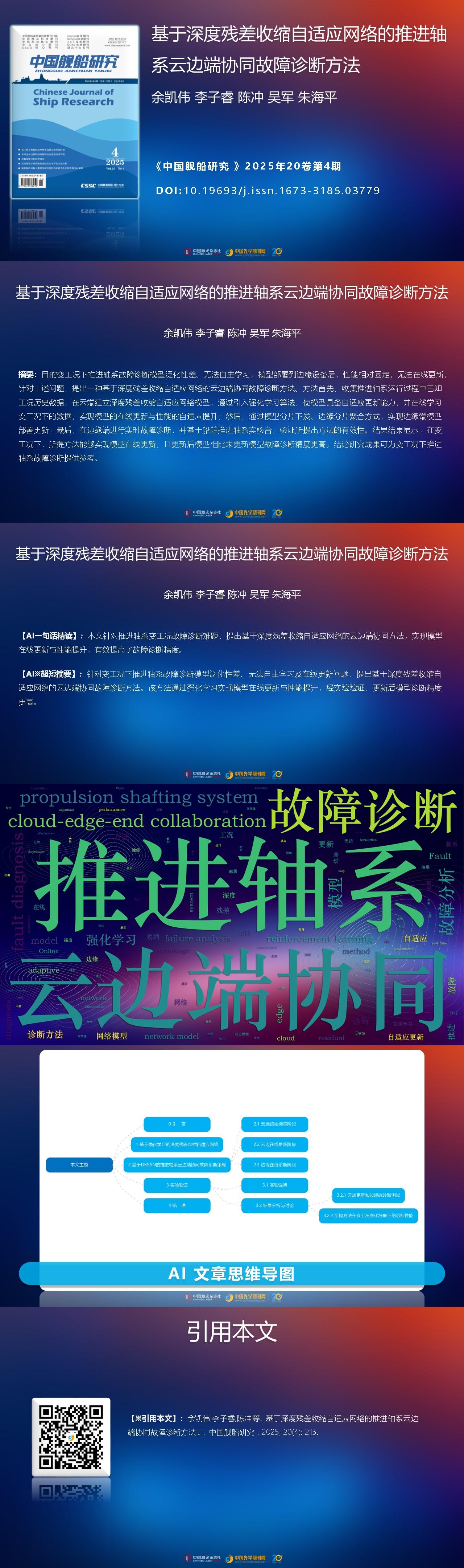 Kaiwei YU, Zirui LI, Chong CHEN, Jun WU, Haiping ZHU. Deep residual shrinkage adaptive network-based cloud-edge-end collaborative fault diagnosis method for propulsion shafting system[J]. Chinese Journal of Ship Research, 2025, 20(4): 213
