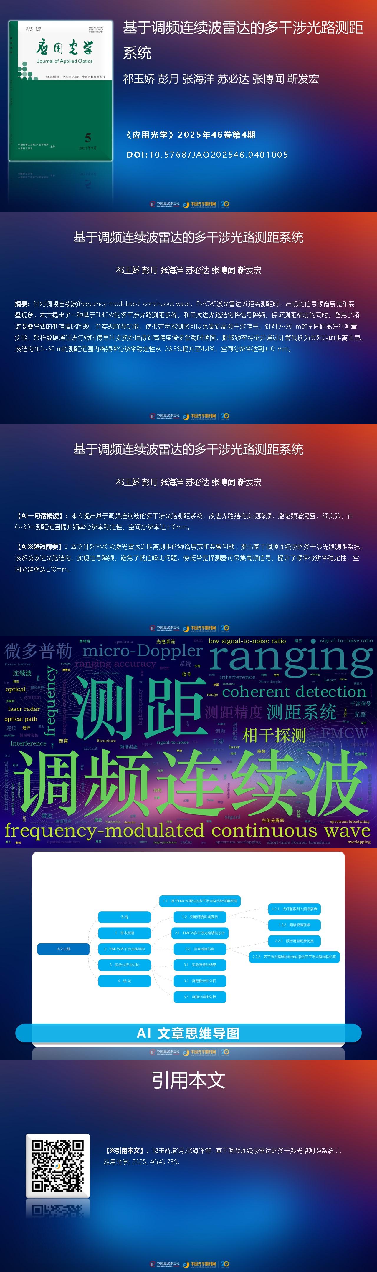 Yujiao QI, Yue PENG, Haiyang ZHANG, Bida SU, Bowen ZHANG, Fahong JIN. Multi-interference optical circuit ranging system based on FMCW laser radar[J]. Journal of Applied Optics, 2025, 46(4): 739