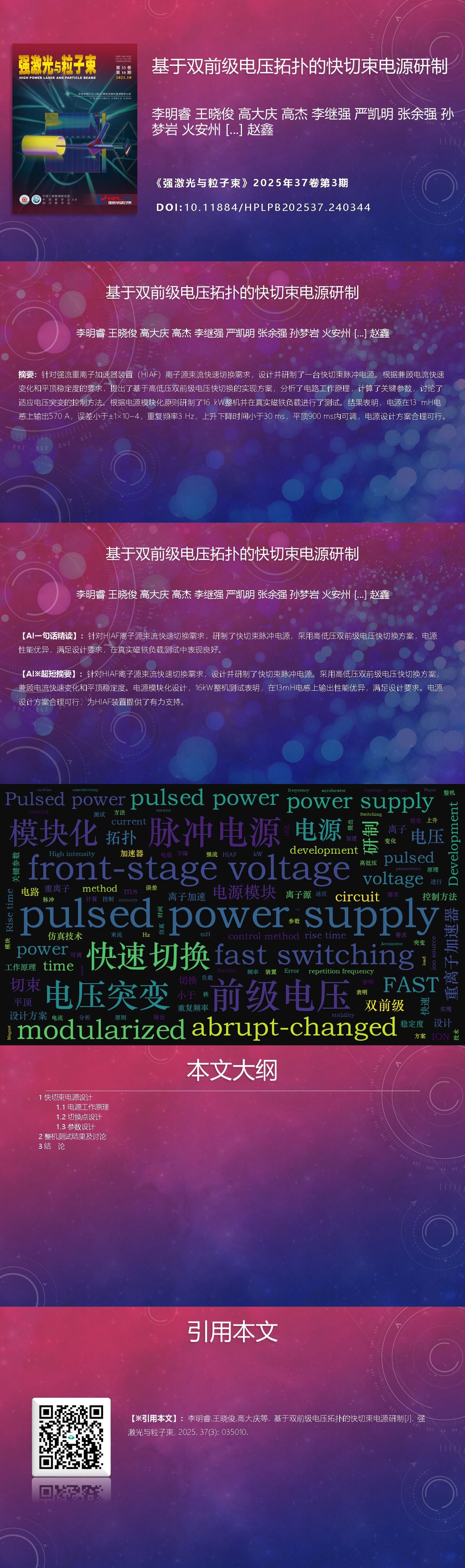 Mingrui Li, Xiaojun Wang, Daqing Gao, Jie Gao, Jiqiang Li, Kaiming Yan, Yuqiang Zhang, Mengyan Sun, Anzhou Huo, Zhengyu Wang, Xin Zhao. Development of dual front-stage voltage fast pulsed power supply[J]. High Power Laser and Particle Beams, 2025, 37(3): 035010