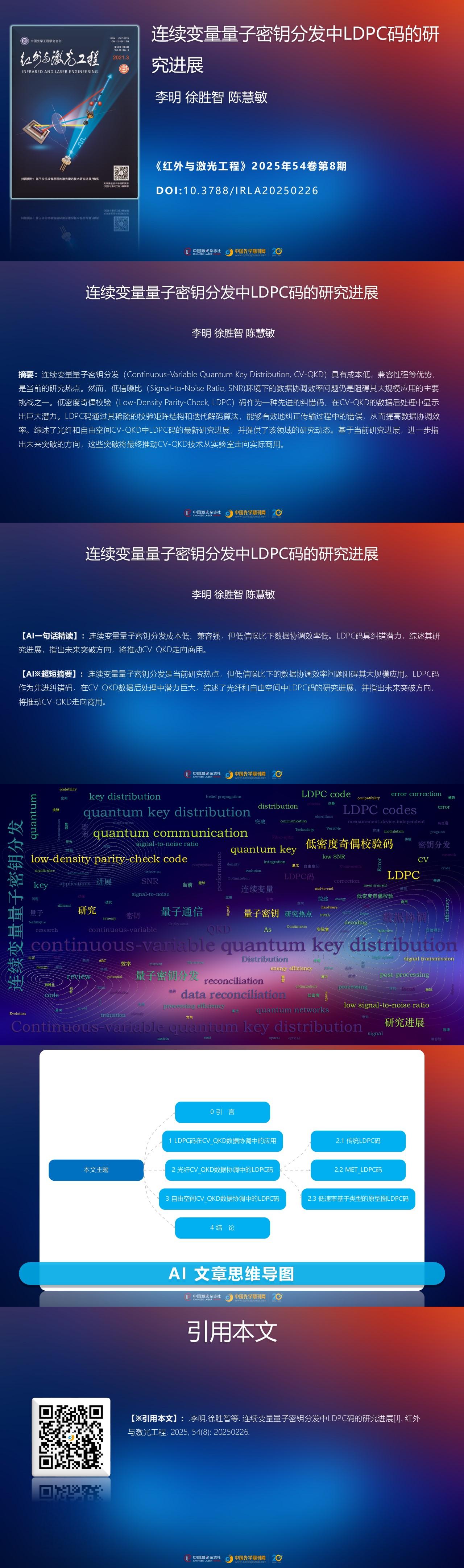 Progress The evolution of LDPC codes in CV-QKD reconciliation can be categorized into three transformative phases. Initially, traditional LDPC codes demonstrated promising results, achieving reconciliation efficiencies of up to 88.7% at an SNR of 1.76 dB. However, their performance degraded significantly in ultra-low SNR regimes (<0.1 dB), limiting their applicability for long-distance quantum communication. The second phase marked a breakthrough with the introduction of multi-edge-type (MET) LDPC codes, which exhibited superior performance in low-SNR conditions. These codes achieved remarkable reconciliation efficiencies of 96.9% at an SNR of 0.029 dB, enabling secure key distribution over distances extending to 140 km. Further enhancements were realized through GPU-accelerated quasi-cyclic MET-LDPC (QC-MET-LDPC) variants, which pushed reconciliation efficiencies close to 99% while maintaining high processing speeds. For free-space CV-QKD systems, the dynamic and unpredictable nature of atmospheric turbulence poses additional challenges. Adaptive-rate LDPC codes have been developed to mitigate these effects, dynamically adjusting code rates in response to fluctuating channel conditions. These adaptive schemes have demonstrated significant improvements, boosting key rates by 87.5 kbit/s in experimental settings. Moreover, the integration of type-based-protograph (TBP) LDPC codes with high-dimensional reconciliation techniques has further enhanced performance, increasing secure key rates by up to 165% compared to traditional methods.