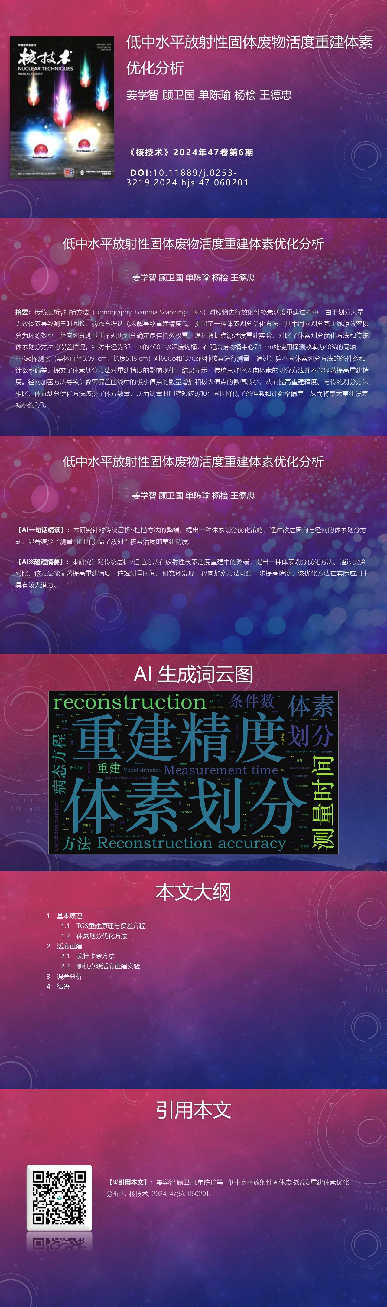Xuezhi JIANG, Weiguo GU, Chenyu SHAN, Hui YANG, Dezhong WANG. Optimization analysis of low and medium level radioactive solid waste activity reconstruction voxels[J]. NUCLEAR TECHNIQUES, 2024, 47(6): 060201