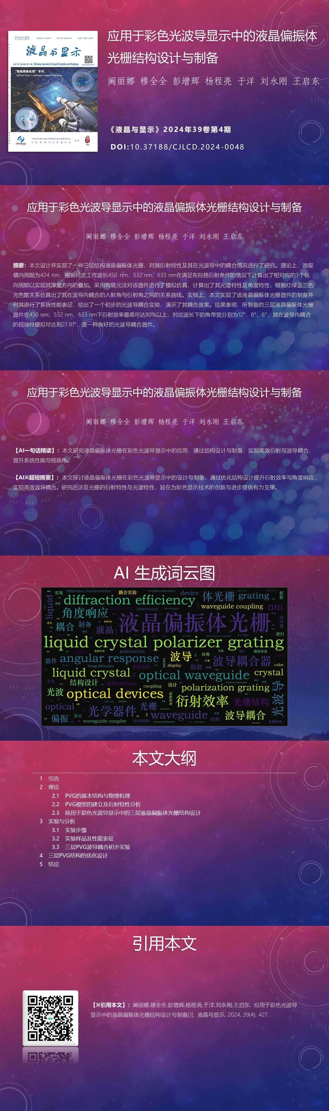 Lina KAN, Quanquan MU, Zenghui PENG, Chengliang YANG, Yang YU, Yonggang LIU, Qidong WANG. Design and fabrication of liquid crystal polarizing grating used in color optical waveguide display[J]. Chinese Journal of Liquid Crystals and Displays, 2024, 39(4): 427
