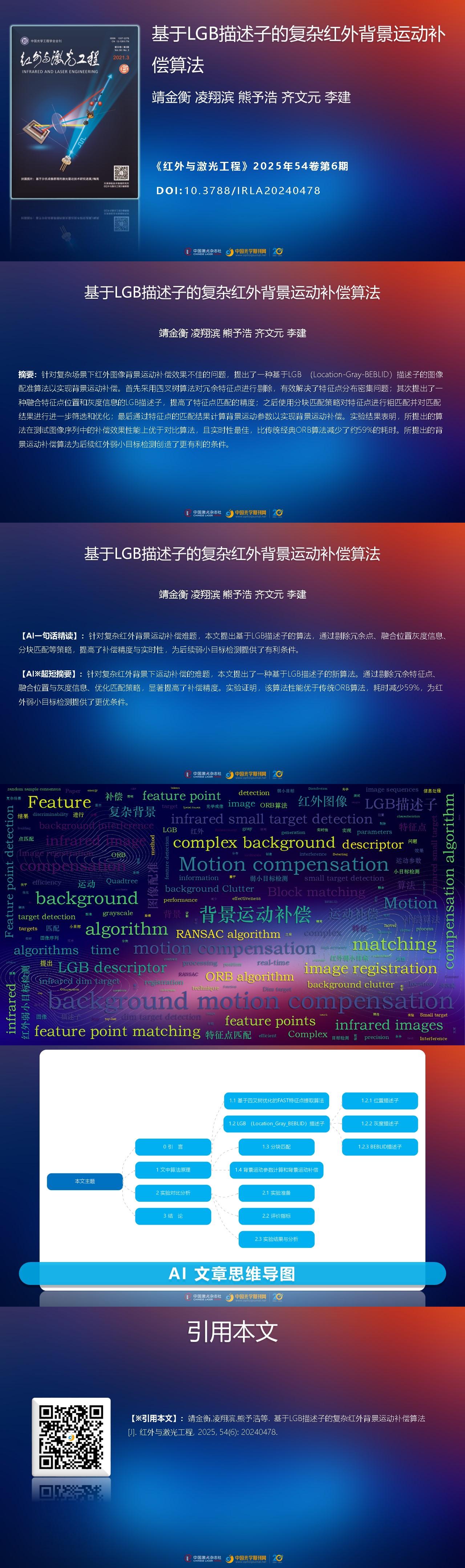 ConclusionsTo address the challenge of inadequate background motion compensation in complex infrared scenes, this paper introduces a novel image registration method based on LGB descriptors. Initially, the algorithm employs a quadtree technique to optimize the distribution of feature points, mitigating the issue of redundancy. Building upon the BEBLID descriptor, the LGB descriptor is proposed, incorporating both the position and grayscale information of feature points. This enhancement significantly improves the precision and discriminability of feature point matching. Then the matching time is reduced by the proposed block matching strategy. The RANSAC algorithm is then utilized to refine and enhance the matching results. By calculating background motion parameters from the feature point information, effective background motion compensation is achieved, thereby eliminating background interference. Experimental results demonstrate that this algorithm excels in background motion compensation for complex infrared images, outperforming other methods in terms of the OLE, NFAM and correct matching rate metrics. The time efficiency of generating descriptors is impressive, showing a reduction of approximately 38% compared to the BEBLID algorithm. Moreover, the proposed algorithm reduces matching time by approximately 58% compared to point-by-point matching.The total processing time of our algorithm is about 59% less than that of the ORB algorithm. This method not only improves the effectiveness of background motion compensation in complex infrared scenes but also enhances its efficiency, paving the way for more effective infrared dim target detection.