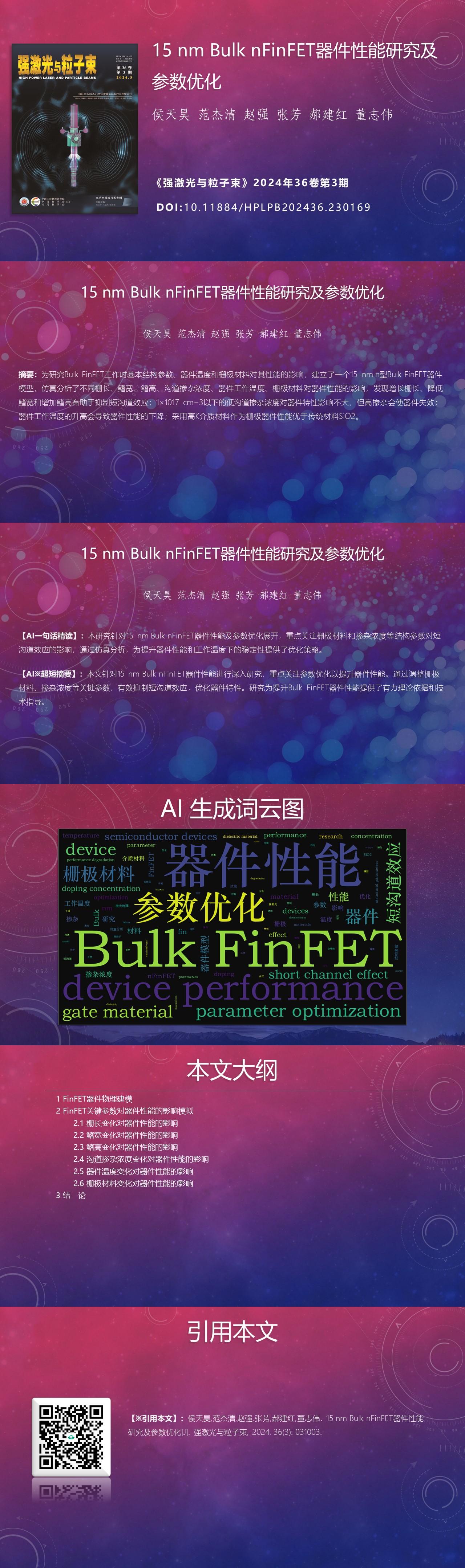Tianhao Hou, Jieqing Fan, Qiang Zhao, Fang Zhang, Jianhong Hao, Zhiwei Dong. Performance research and parameter optimization of 15 nm Bulk nFinFET device[J]. High Power Laser and Particle Beams, 2024, 36(3): 031003