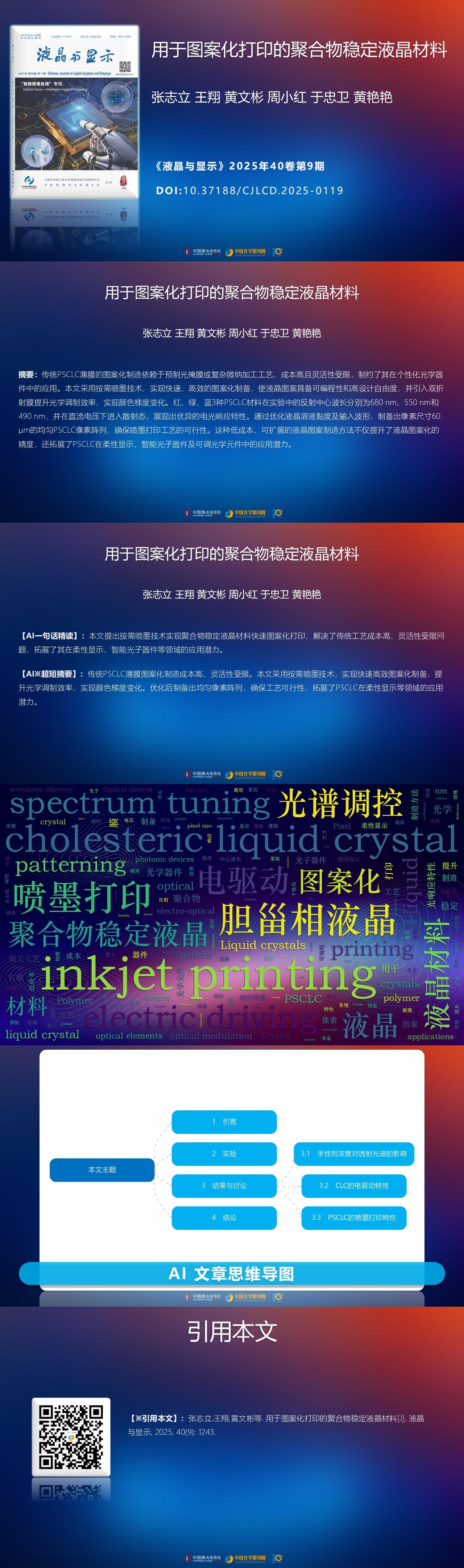 Zhili ZHANG, Yi SUN, Wenbin HUANG, Xiaohong ZHOU, Zhongwei YU, Yanyan HUANG. Polymer-stabilized liquid crystals for pattern inkjet printing[J]. Chinese Journal of Liquid Crystals and Displays, 2025, 40(9): 1243