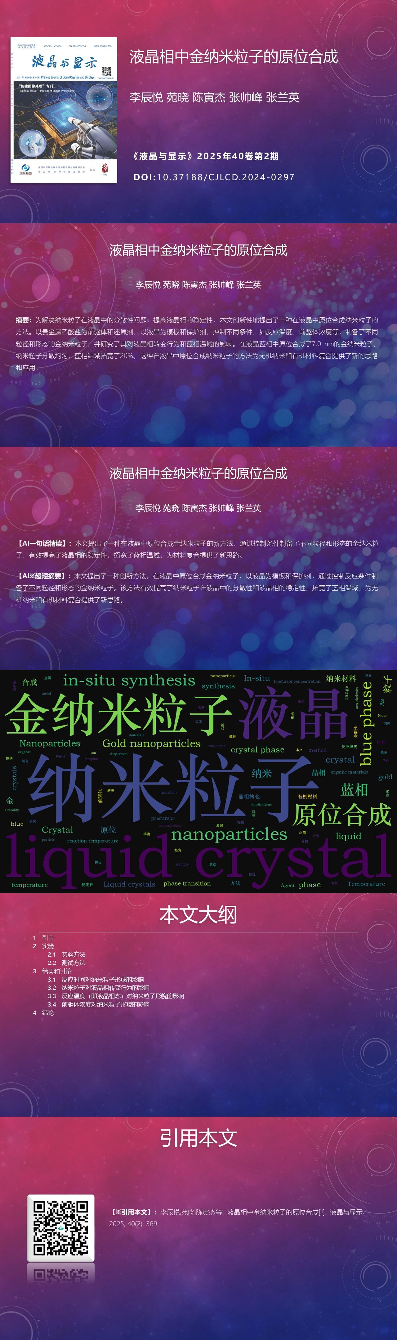 Chenyue LI, Xiao YUAN, Yinjie CHEN, Shuaifeng ZHANG, Lanying ZHANG. In-situ synthesis of gold nanoparticles in liquid crystal phases[J]. Chinese Journal of Liquid Crystals and Displays, 2025, 40(2): 369