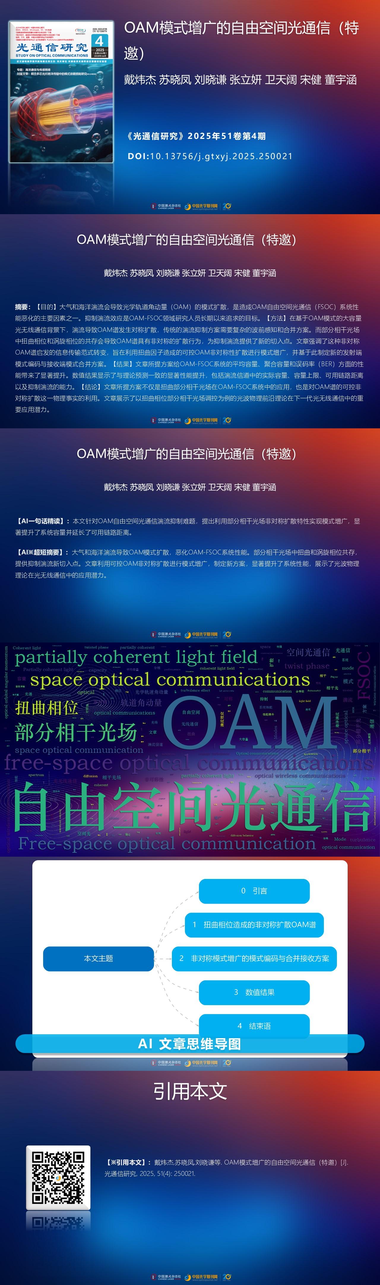 Weijie DAI, Xiaofeng SU, Xiaoqian LIU, Liyan ZHANG, Tiankuo WEI, Jian SONG, Yuhan DONG. Free-space Optical Communication based on Augmentation of OAM Modes[J]. Study On Optical Communications, 2025, 51(4): 250021