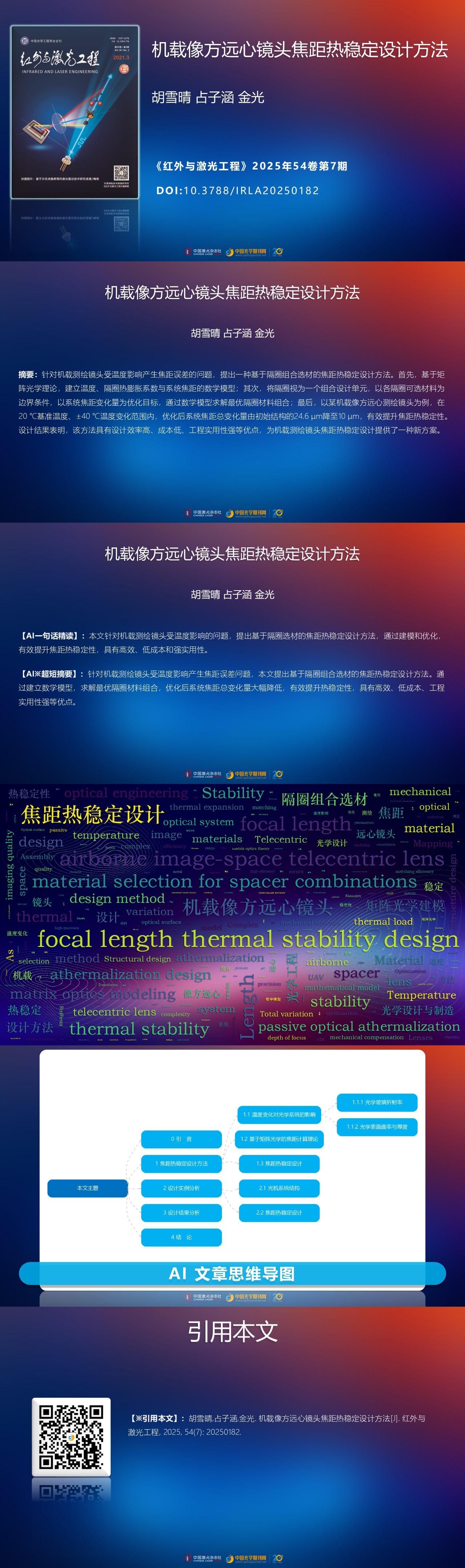 Conclusions A novel thermal stability design method for the focal length of airborne mapping lenses is presented. By constructing a coupled model of temperature, material CTE, and system focal length, and treating the spacer assembly as an optimization unit, global matching of spacer materials is achieved, effectively reducing the impact of temperature on the focal length of the system. Application to an airborne image-space telecentric lens demonstrated a 59.35% reduction in focal length variation over (20±40) ℃, with the total variation being less than the system's depth of focus, meeting the comprehensive requirements of UAV-borne high-precision mapping for focal length stability and imaging quality. Compared to traditional passive optical athermalization designs, which face high complexity challenges in multi-lens systems, and complex mechanical athermalization structures that increase volume, weight, and reduce stability, the proposed method transforms traditional empirical spacer material selection into a quantifiable optimization process through parametric modeling. Focal length thermal stability is enhanced solely by replacing spacer materials, avoiding alterations to the initial structural parameters of the optical system, offering advantages of low design complexity and high engineering operability.