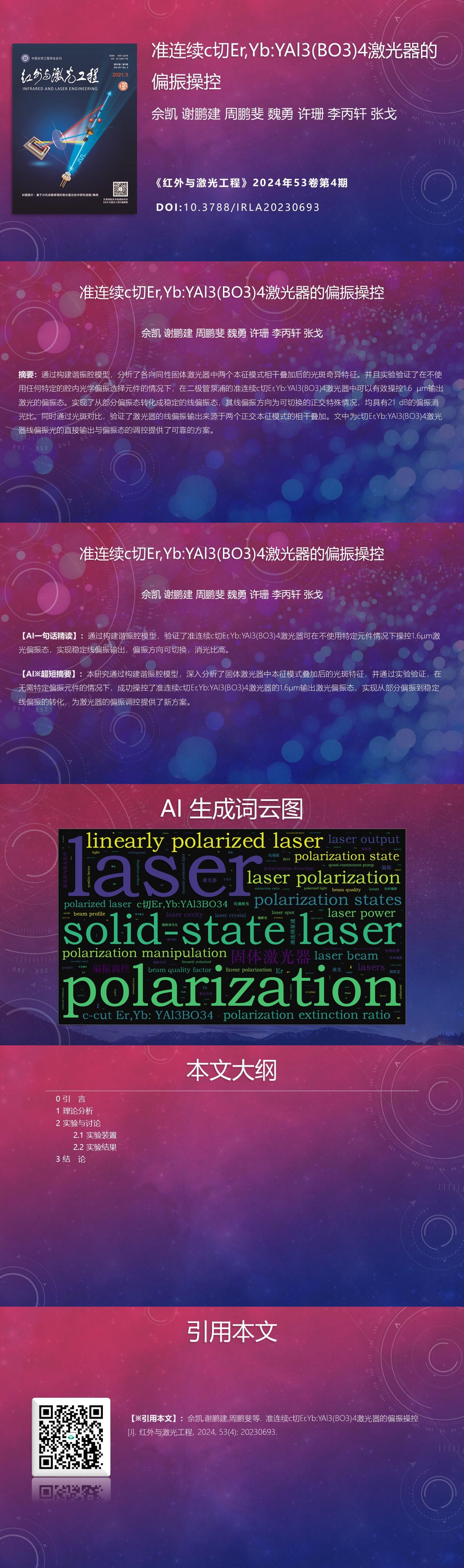 4 laser operated at 1.6 μm, the polarization state of the output laser can be switched from a partially polarized state to a stable linearly polarized state by adjusting the degree of tilt of the output coupling mirror, and the polarization extinction ratio reaches 21 dB, with a pair of orthogonal linear polarization directions that can be switched. In the process of adjusting the angle of the output coupling mirror, the output band of the output light is not changed, and the loss of output power of the generated linearly polarized beam is around 7%, while the quality of the beam in different polarization states does not change significantly. By spot comparison, it is verified that the direct output of line-polarized light from the laser is achieved by coherent synthesis of two orthogonal eigenmodes. This method provides a reliable solution for the direct output and modulation of line polarization of