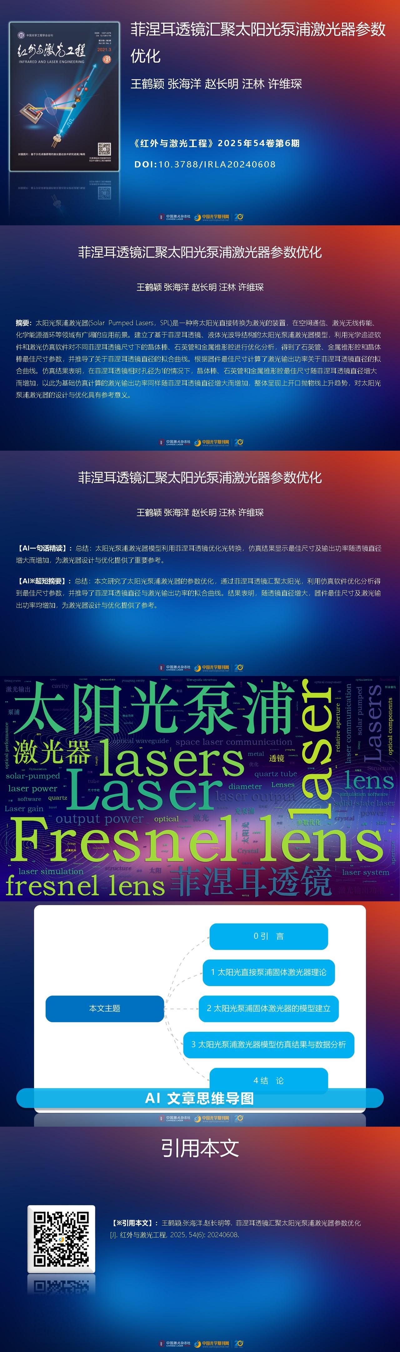 ObjectiveSolar-pumped laser is a device that directly converts sunlight into laser light, holding promising applications in fields such as space laser communication, space laser wireless energy transmission, chemical energy cycling, and material processing. The structure of a solar-pumped laser is typically divided into three major components: a sunlight concentration device, a pumping cavity, and a laser gain medium. Existing research has made certain advancements in the design methods for the size and pumping structure of the gain medium in solar-pumped lasers. However, the intrinsic correlation between the size of the laser and its laser output power has not yet been fully explored. When designing lasers for specific output power requirements, reliance is often placed on empirically selected sizes, leading to frequent mismatches between laser size and desired output power. For example, lasers may be excessively bulky without a corresponding increase in output power, or they may have moderate sizes but suffer from inefficient performance. Due to the lack of a systematic theoretical framework to guide the size design of lasers in addressing these issues, a model of a solar-pumped laser incorporating Fresnel lenses and a liquid optical waveguide structure is established based on existing research foundations. This model is used to explore the potential correlation mechanism between laser output power and laser size, providing a scientific basis for designing more efficient and compact solar-pumped lasers.