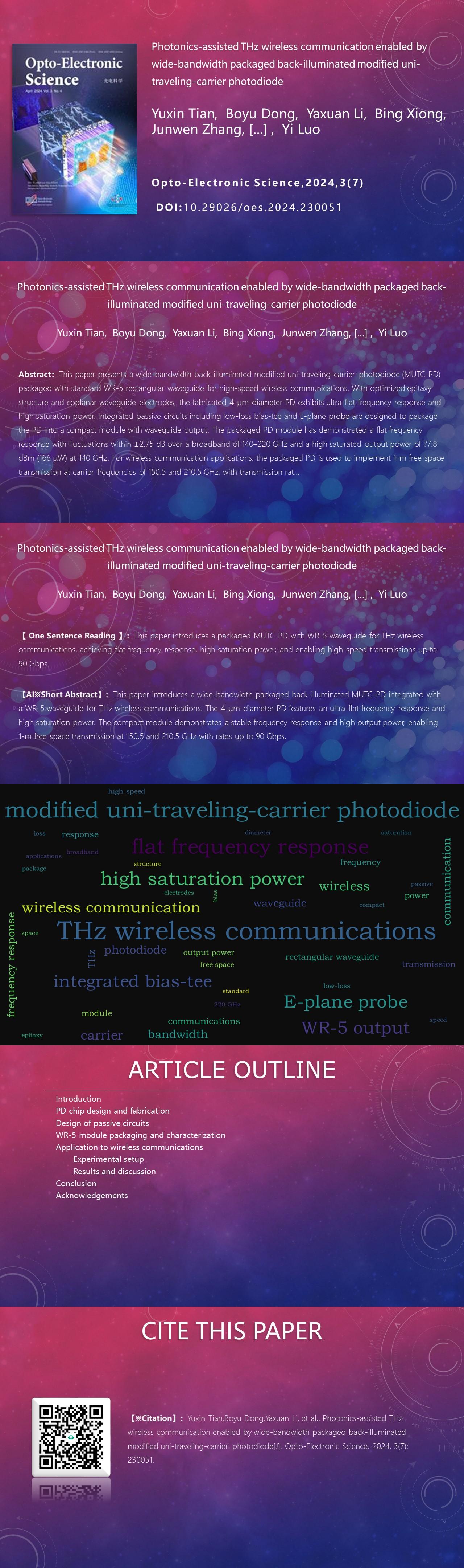 Yuxin Tian, Boyu Dong, Yaxuan Li, Bing Xiong, Junwen Zhang, Changzheng Sun, Zhibiao Hao, Jian Wang, Lai Wang, Yanjun Han, Hongtao Li, Lin Gan, Nan Chi, Yi Luo. Photonics-assisted THz wireless communication enabled by wide-bandwidth packaged back-illuminated modified uni-traveling-carrier photodiode[J]. Opto-Electronic Science, 2024, 3(7): 230051