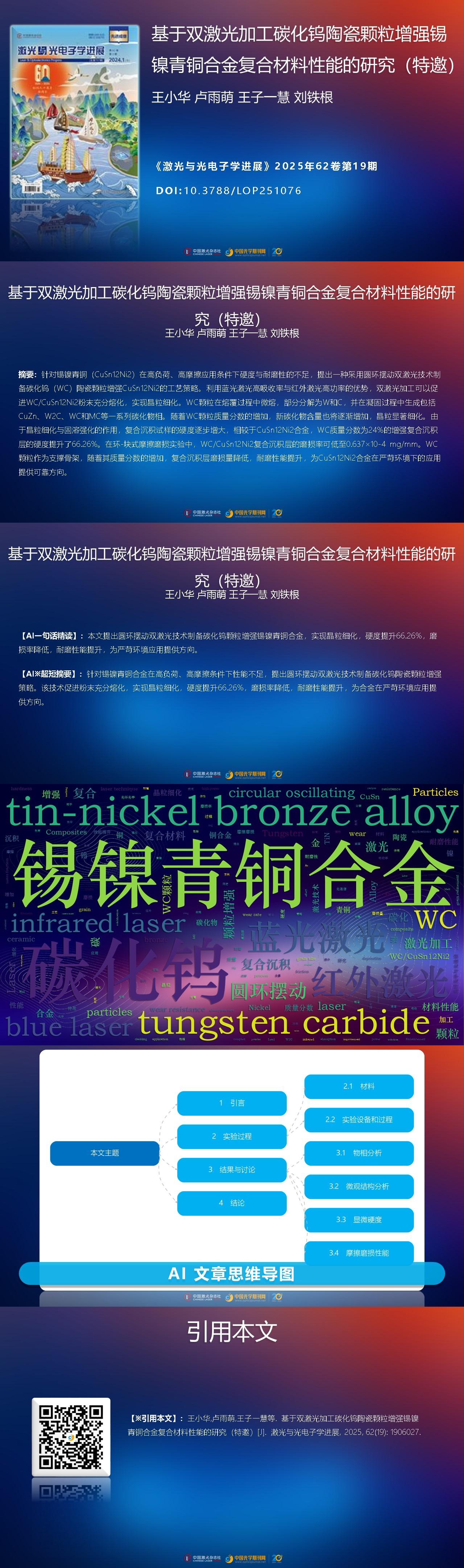 Xiaohua Wang, Yumeng Lu, Ziyihui Wang, Tiegen Liu. Dual-Laser Processed Tungsten Carbide Ceramic Particles for Reinforcing Tin-Nickel Bronze Alloy Composites (Invited)[J]. Laser & Optoelectronics Progress, 2025, 62(19): 1906027